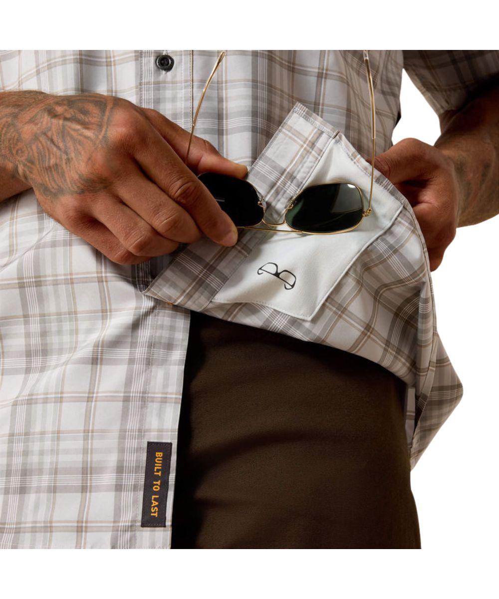 92% Polyester/8% Spandex; 4 Oz. Technical Stretch Fabric; Durastretch Fabric Helps Deliver Unrestricted Movement Through Tough, Active Work; Mesh Lining; Short Sleeves; Button Down Collar And Placket; Single Point Button-Through Flap Chest Pockets With Pen/Pencil Slot; Triple-Stitched Seams Add Durability And Strength To Stand Up To Tough Wear; Microfiber Lens Cloth Is Hidden In The Hem For On-The-Go Cleaning; VentTEK Mesh Panels Provide Ventilation In Key Areas To Help Keep You Cool And Comfortable; Embroidered Logos; Long Back Hem Helps Provide Extra Coverage While You Bend, Stretch, Or Reach; Greater Arm Mobility Helps Extend Arm And Shoulder Range-Of-Motion So You Can Move Freely; Moisture Movement Technology Helps Wick Moisture Away From The Skin To Keep You Dry And Comfortable; UPF 50 Sun Protection Fabric Helps Block Harmful UV Rays, Keeping You Covered And Comfortable; Contains Materials That Meet The Bluesign Sustainability Standards; Plaid Print; Color: Grey/Micro Chip; Style #10071545