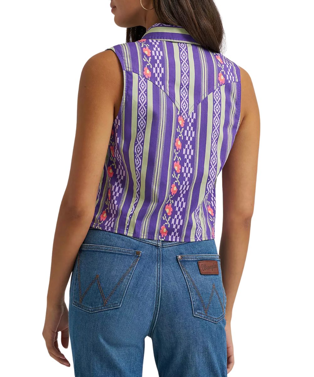 100% Cotton; Slim Fit; Sleeveless; Spread Collar; Snap Front Placket; Pearl Snaps; Single Point Snap Flap Chest Pockets With 'W' Logo Stitching And Logo Label; Single Point Western Yokes; Cropped Length; Geometric Checotah Print; Color: Purple; Style #112375054