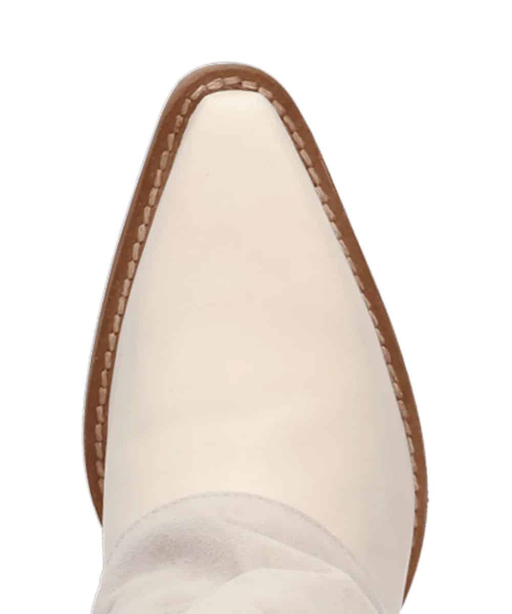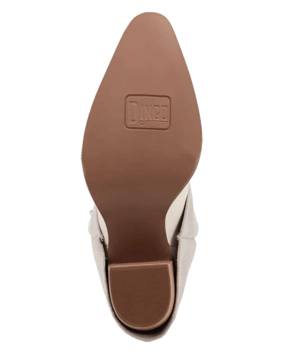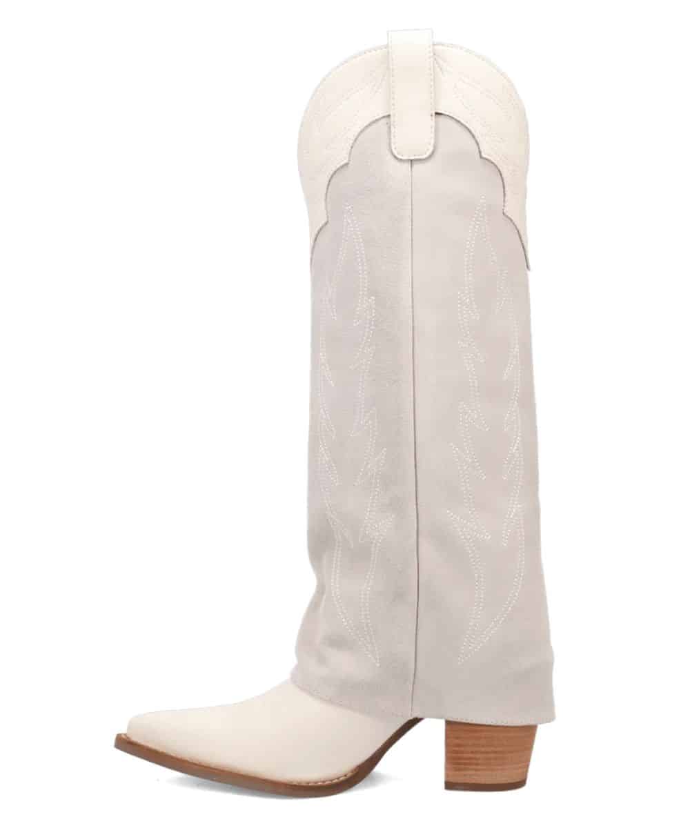 16″ Shaft; White Leather Foot; Light Grey Cuffed Boots Featuring Western Stitching; White Leather Pull Tabs For Easy On; Cushion Comfort Insole; TPR Rubber Outsole; 2 3/4″ TPR Unit Heel; Snip Toe; Color: White/Light Grey; Style #DI2280
