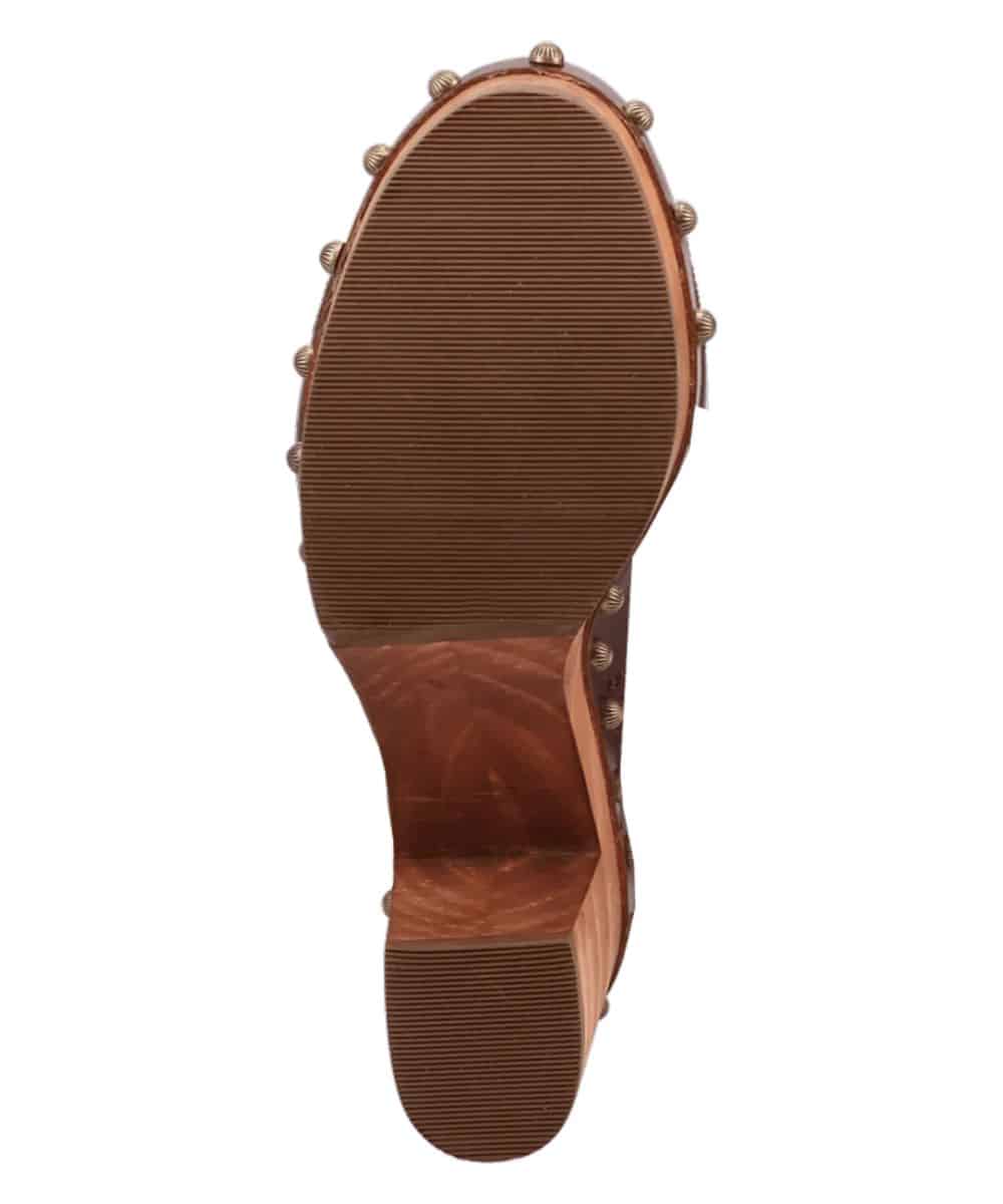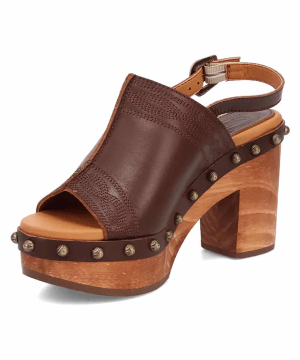 Leather Upper With Studding And Intricate Stitching; Open Heel With Adjustable Buckle Closure; Cushion Comfort Insole; Rubber Outsole; 3 1/4″ Wood Heel; Open Round Toe; Color: Brown; Style #DI2326