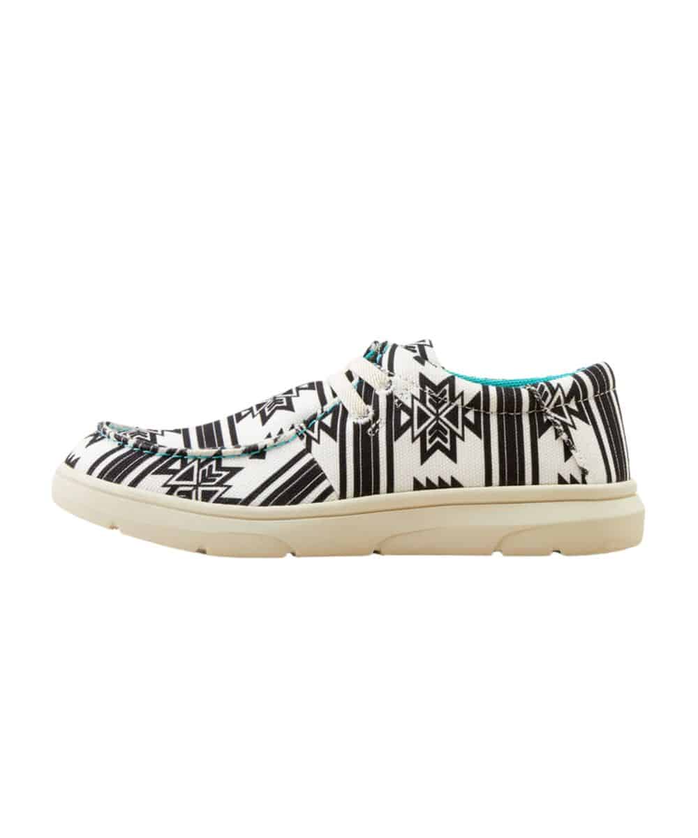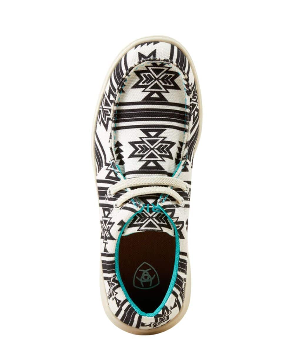Canvas Fabric Upper; Turquoise Accents; 2.5″ Height; Elastic Entry; Breathable And Cushioning Insole; FLX Foam Sole Has A Light Springy Feel That Cushions Each Step; Flat Bottom; Moc Toe; Color: Stark Southwest; Style #10050911