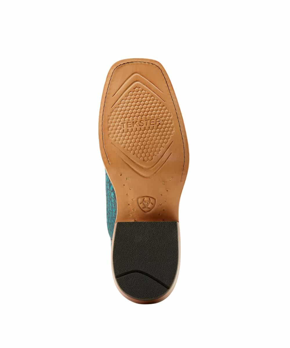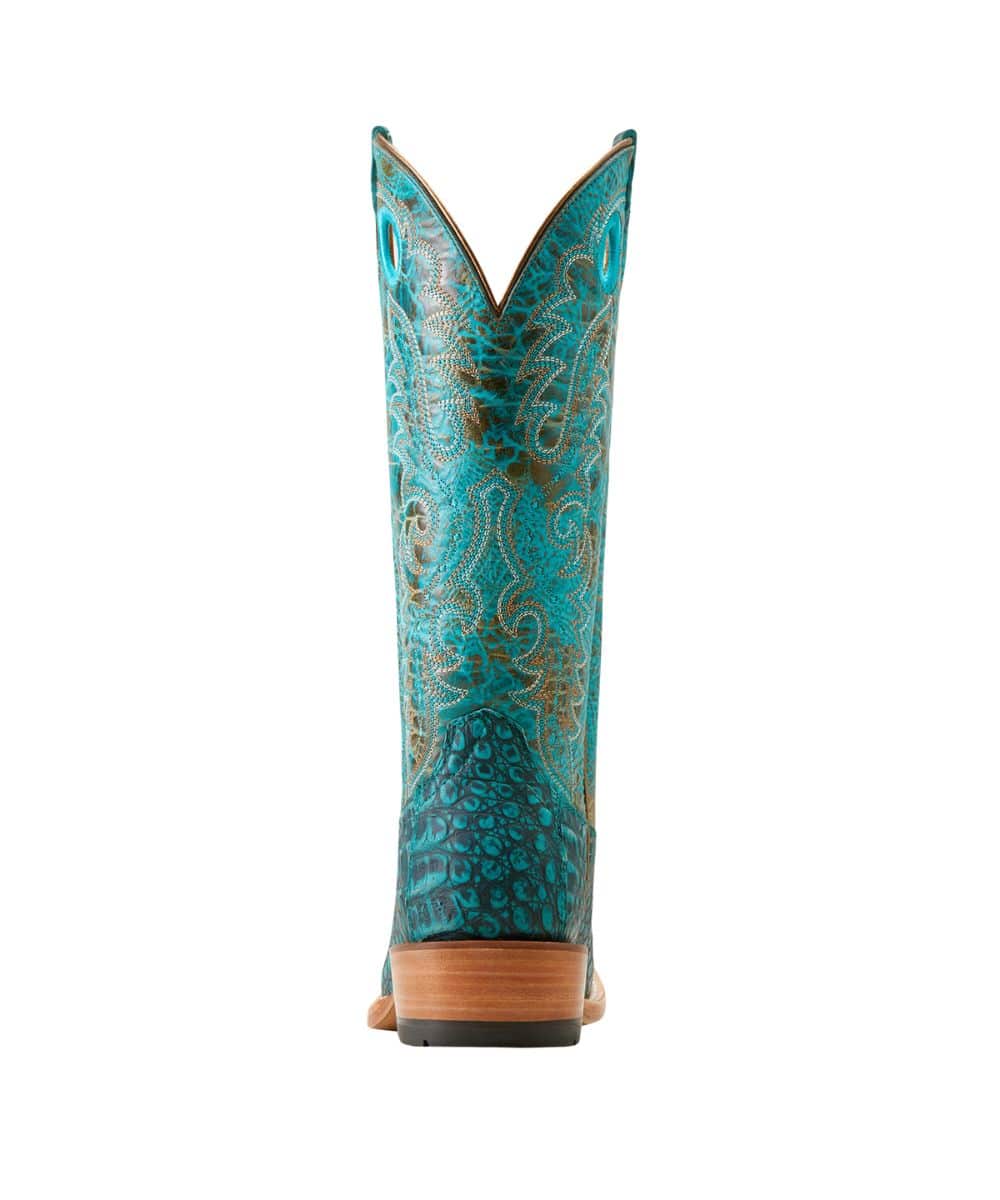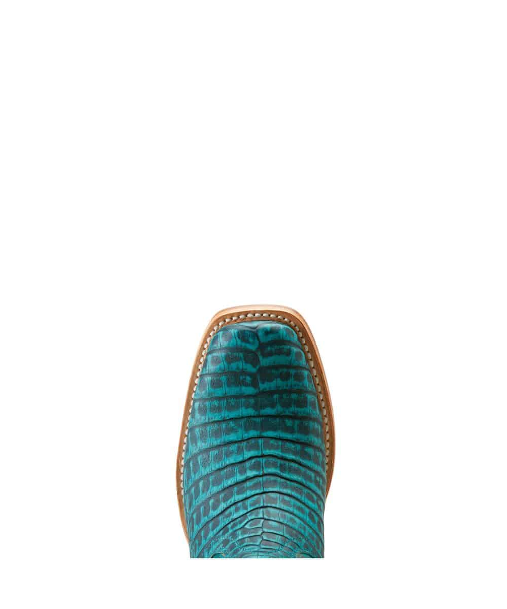 13″ Height; Turquoise Sueded Caiman Belly Leather Foot; Pull Holes For Easy On; Leather Lining; Removable Pro Performance Insole For Cushioning Shock Absorption; TekStep Provides Toe-To-Heel Cushion For Comfort; ATS Technology Provides Ergonomic Support On Uneven Terrain; Vegetable-Tanned Leather Sole; Resoleable Goodyear Welt Construction; 1.75″ Futurity Heel; Cutter Toe; Color: Turquoise/Amazonite; *Ariat States This Style Runs Big* Style #10050967