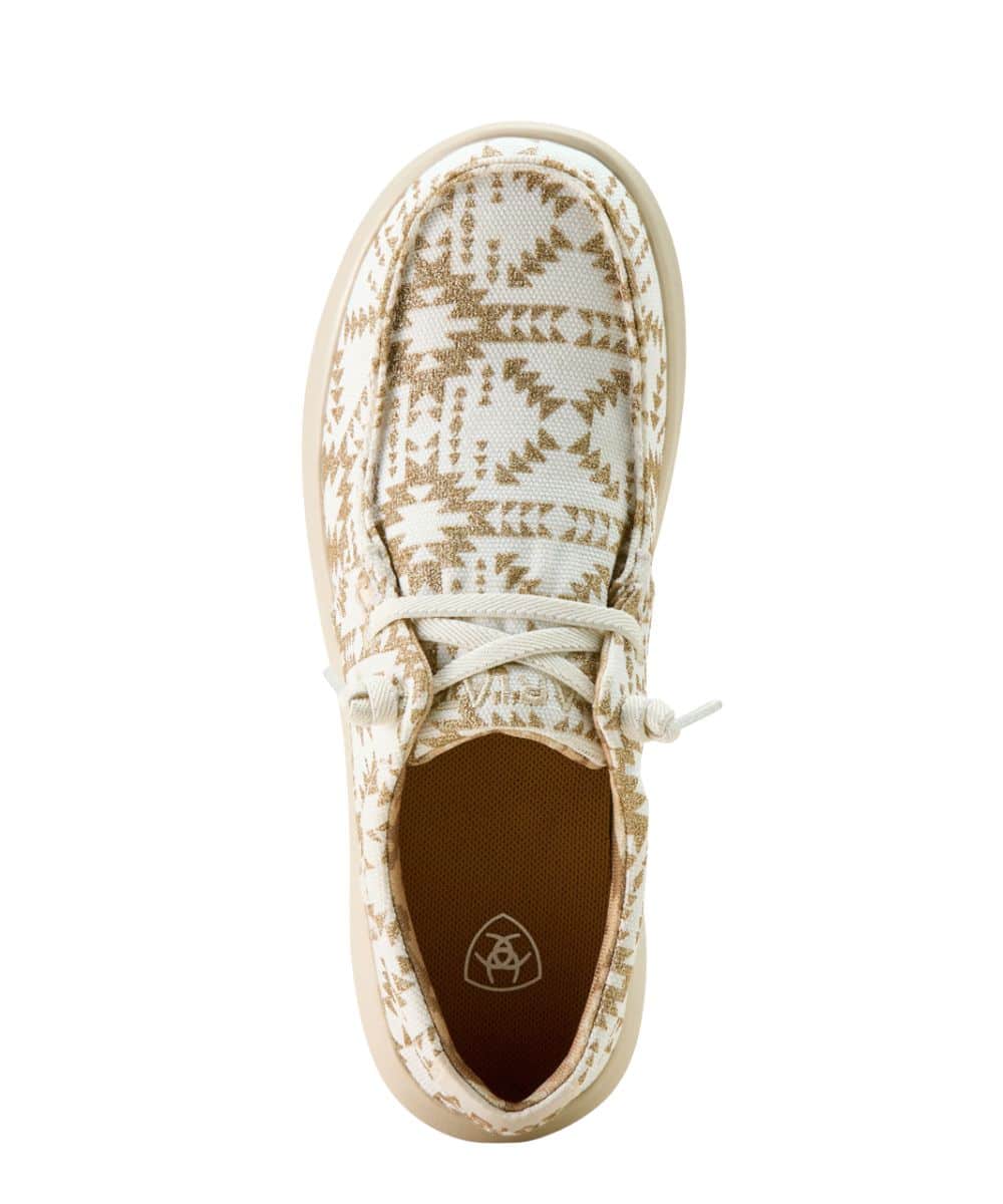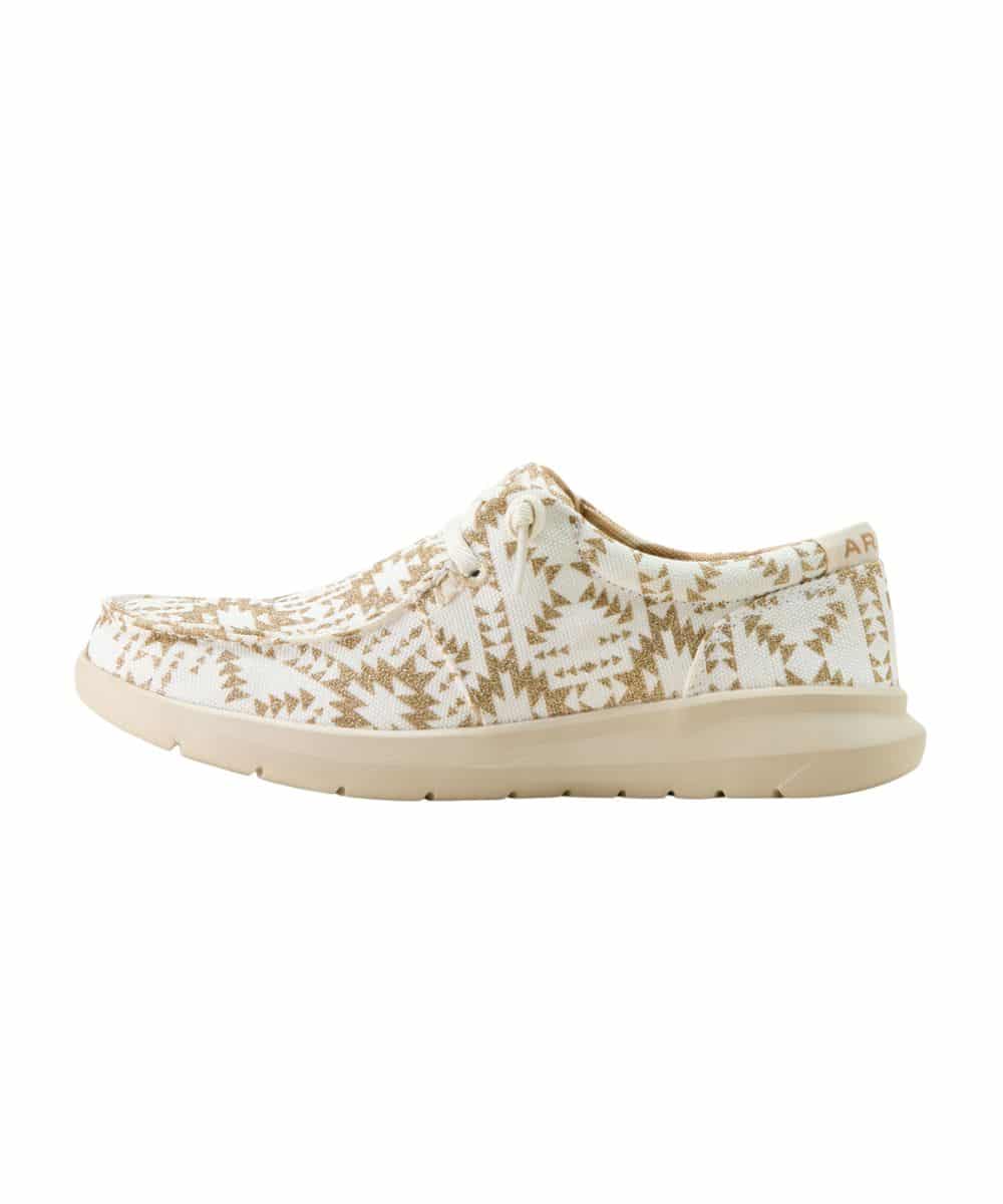 3″ Height; Southwestern Glitter Fabric Upper; Elasticized Laces; Mesh Lining; Open Cell Cushioning Insole; FLX Foam Sole Has A Light Springy Feel That Cushions Each Step; Flat Heel; Moc Toe; Color: White/Gold; Style #10063883