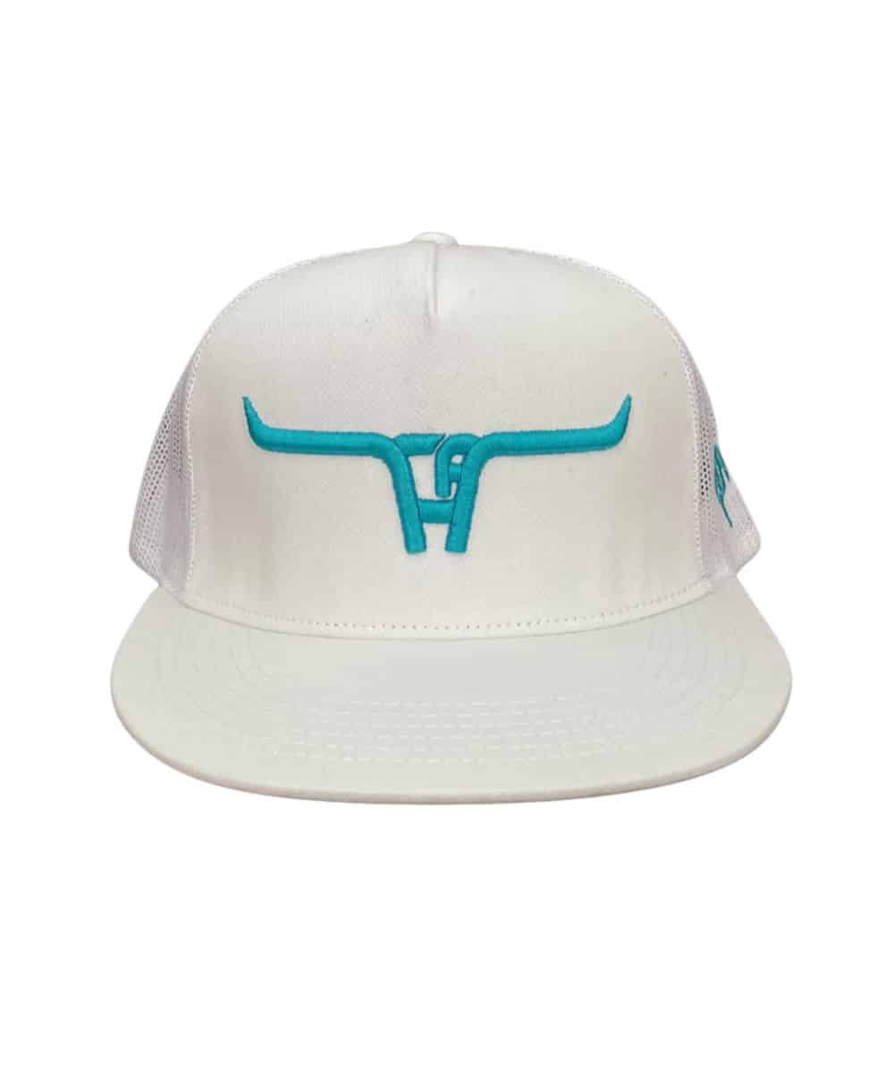 5 Panel Construction; White Front And Bill; Turquoise Longhorn Puff Stitch Embroidery With Logo On Front; Flat Bill; White Mesh Sides And Back; Adjustable Snapback Closure; One Size Fits Most; Color: White; Style #6006WHT-S127