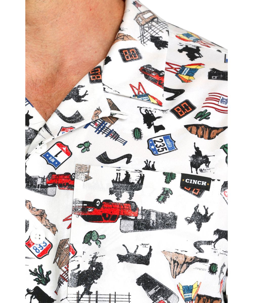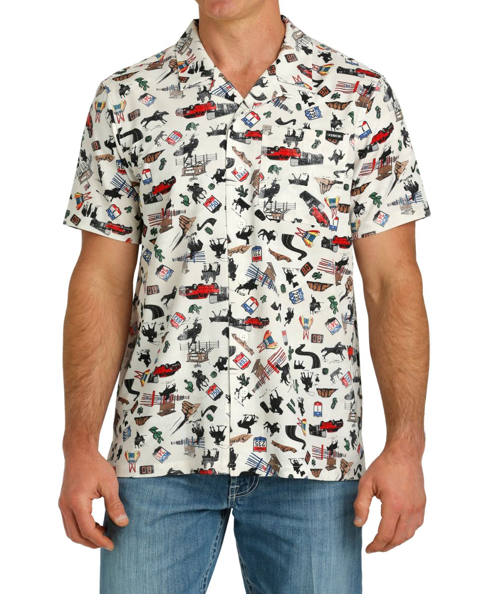 Printed Woven Polyester/Spandex; Lightweight; Short Sleeves; Button Down Placket; White Marble Buttons; Single Open Chest Pocket With Logo Label; Straight Back Yoke With Box Pleat; Color: White With Rodeo Road Print; Style #MTW1401046