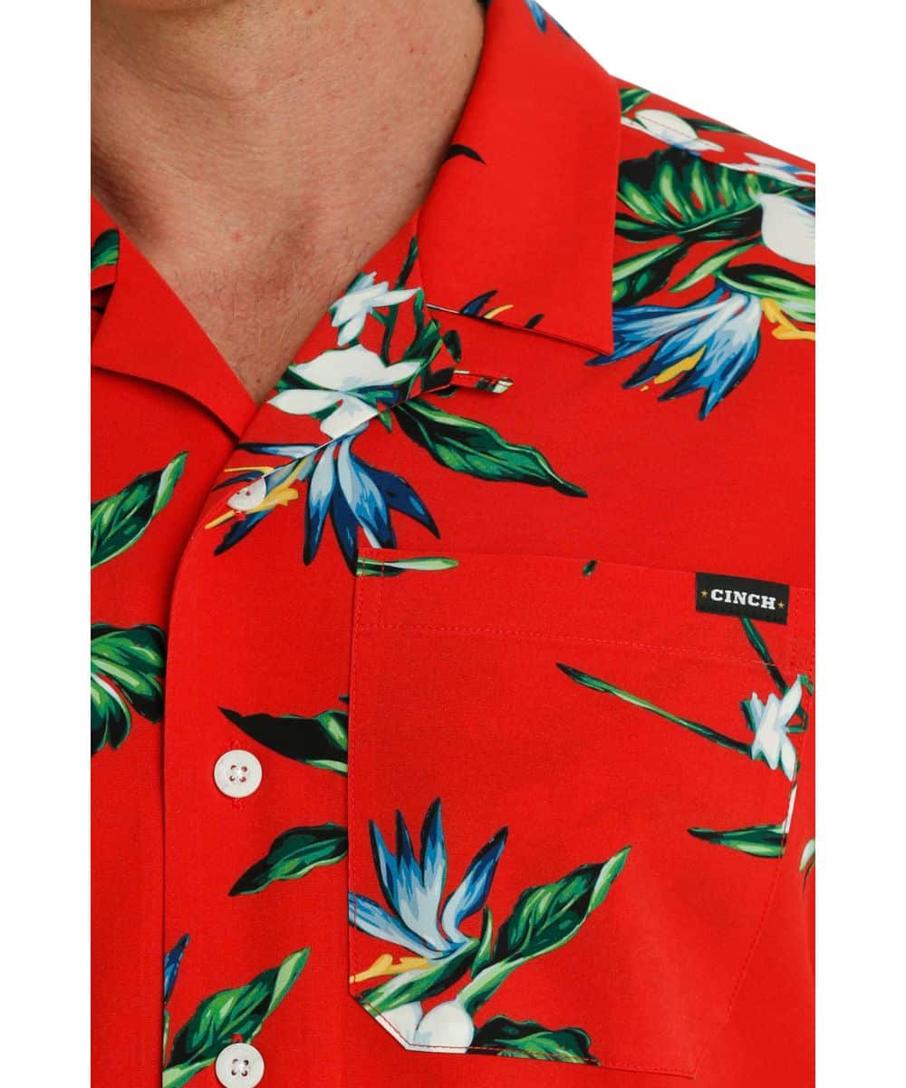 Printed Cotton Plain Weave; Short Sleeves; Spread Collar; Button Down Front Placket; White Pearl Buttons; Single Open Chest Pocket With Logo Label; Color: Red With Tropical Flowers; Style #MTW1401040