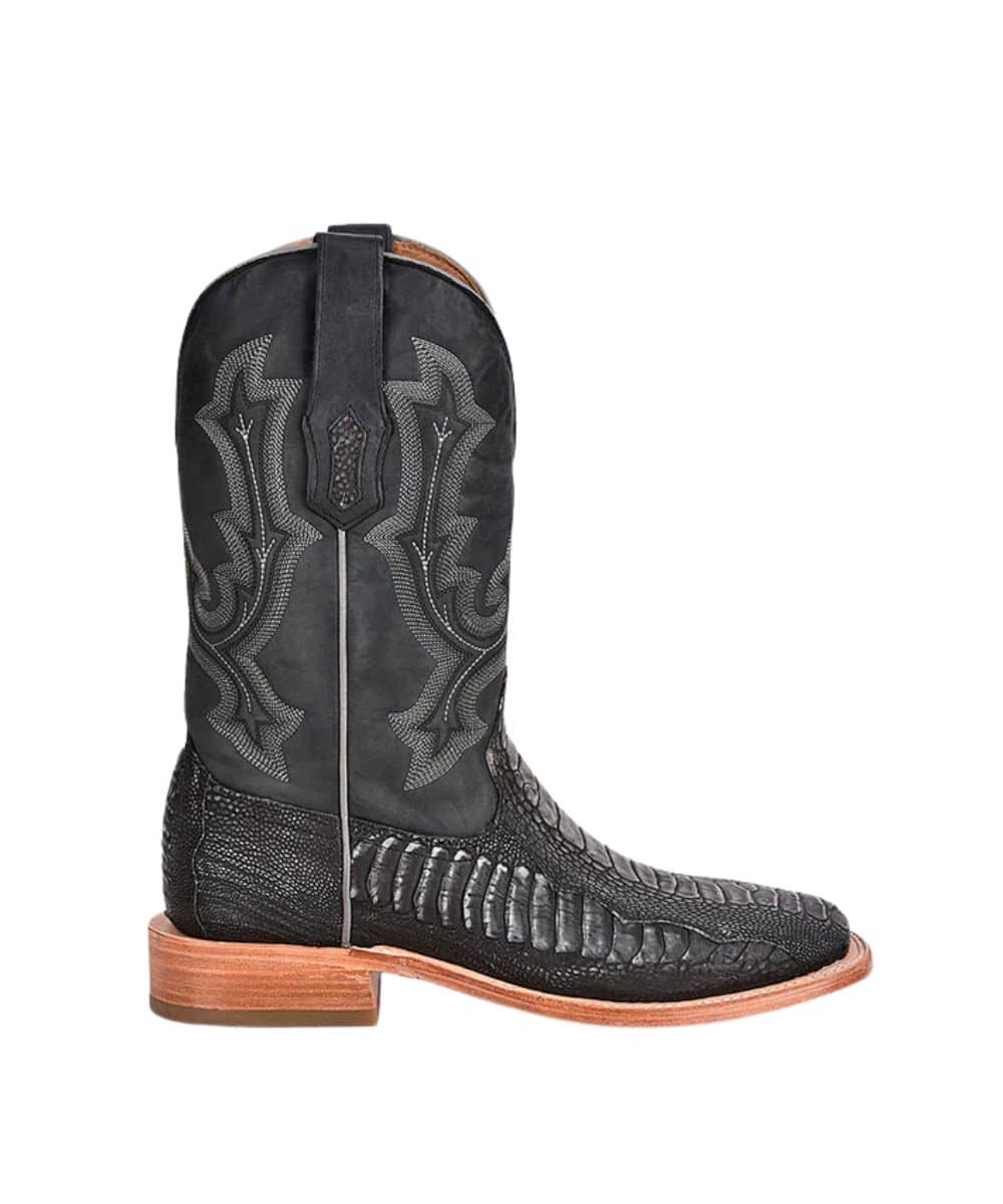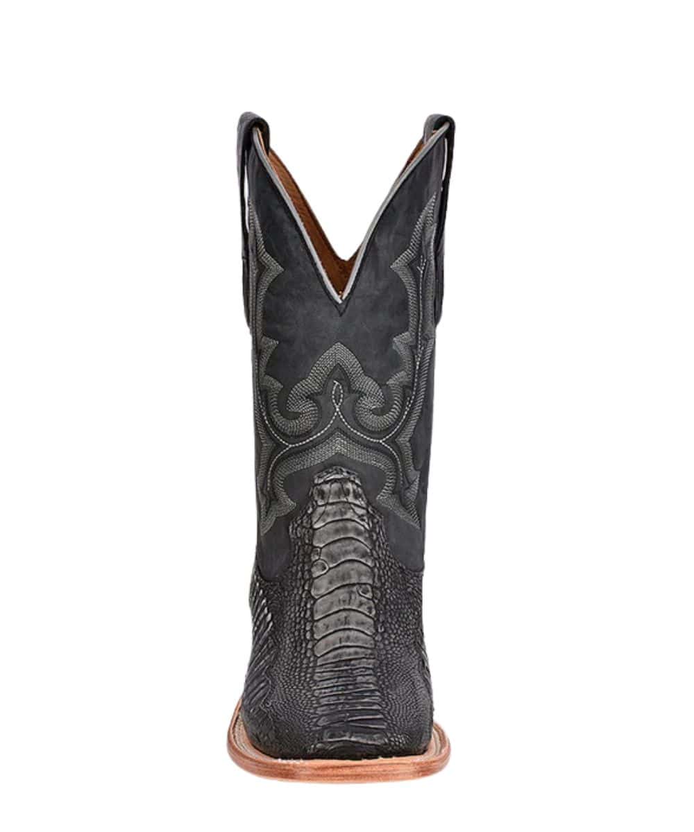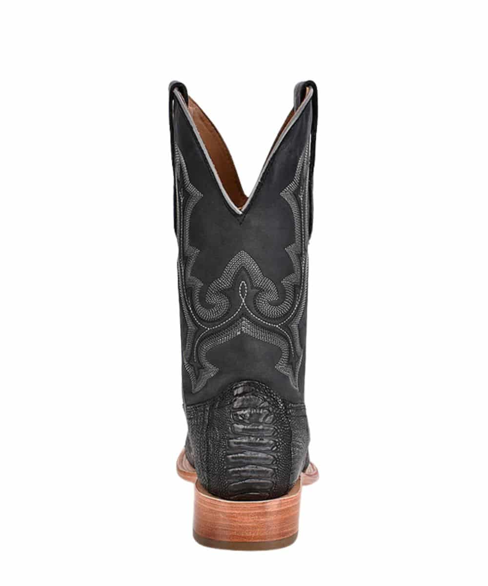 11″ Shaft; Black Ostrich Leg Leather Vamp And Counter; Leather Shaft With Contrast Embroidery; Leather Pull Tabs For Easy On; Leather Lining; Cushioned Leather Insole; Leather Outsole With A Rubber Insert And A Rubber Heel Cap; 1 1/2″ Stacked Heel; Wide Square Toe; Color: Black; Style #A4291