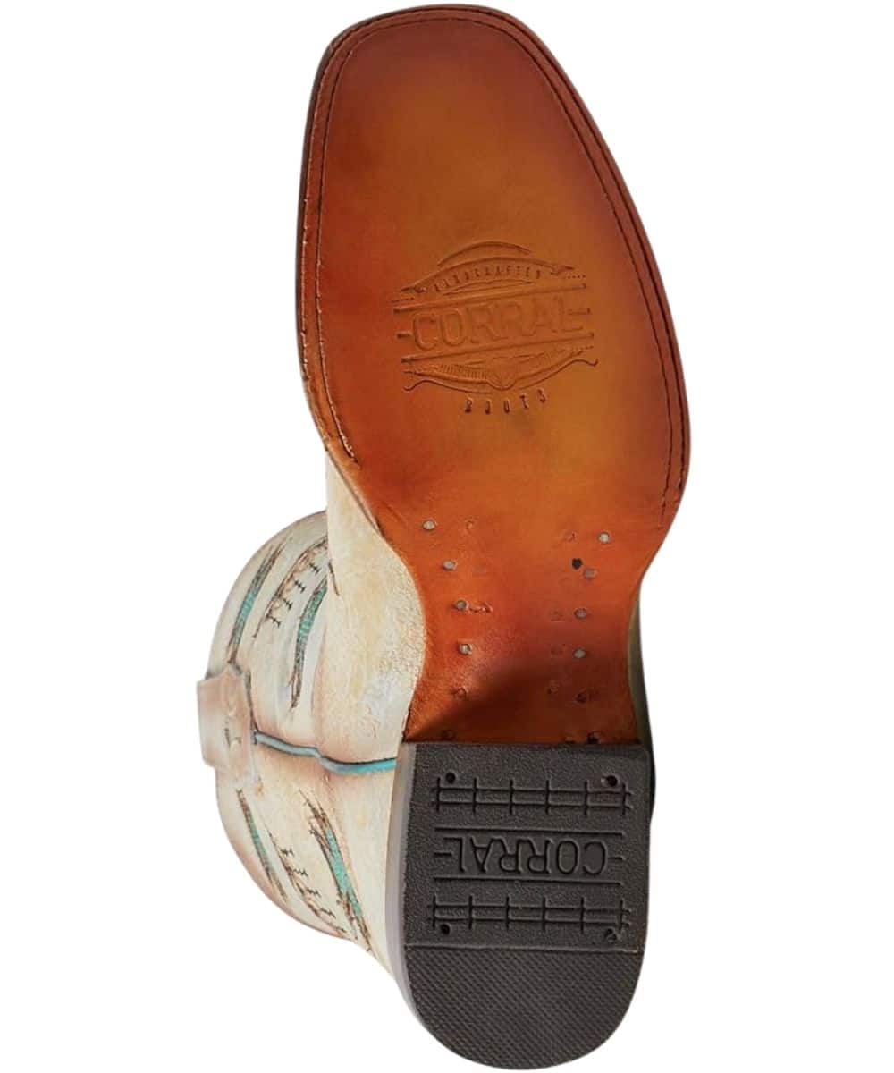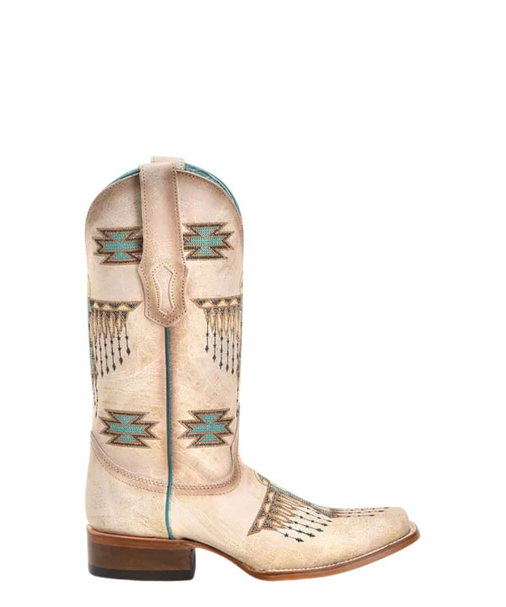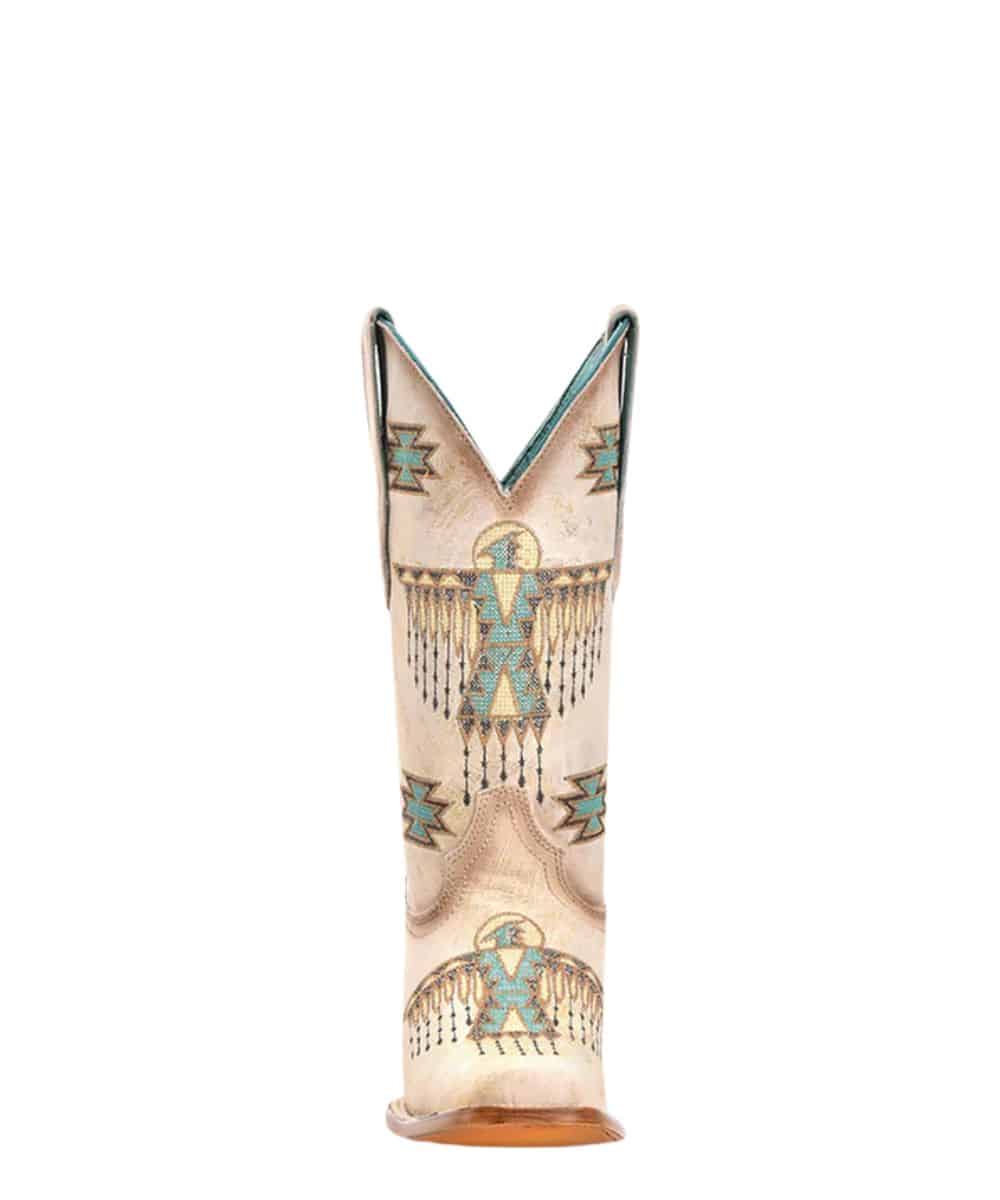 11.5″ Shaft; White Cowhide Leather Boot Featuring Turquoise Woven Eagle Embroidery; Leather Pull Tabs For Easy On; Smooth Pig Leather Lining; Cushioned Leather Insole; Goodyear Welt Construction; Leather Outsole With Rubber Heel Cap; 1.5″ Fiberglass Heel; Square Toe; Color: White; Style #Z5219
