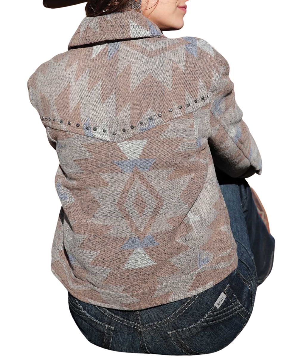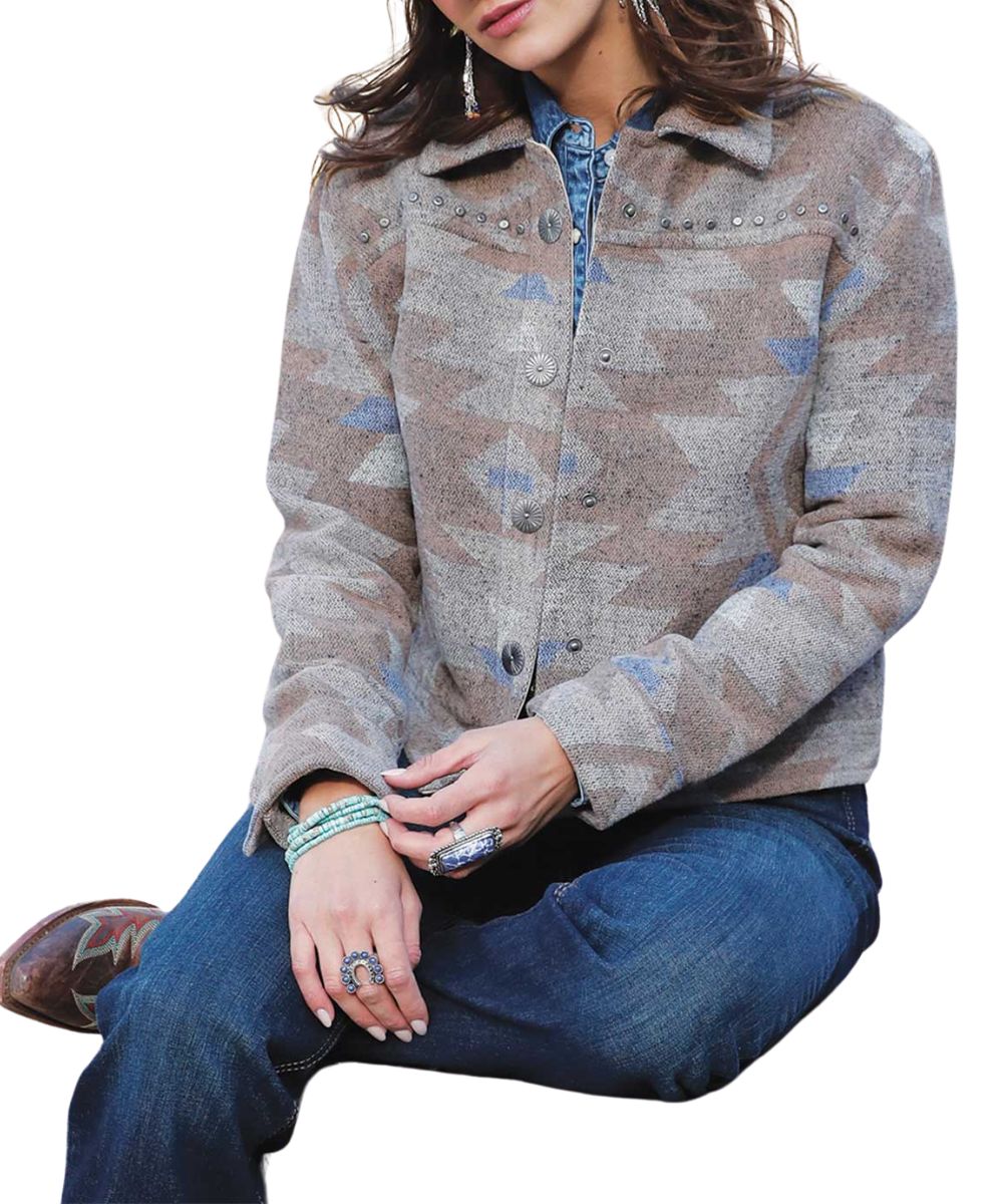 Polyester Tweed; Long Sleeves; Spread Collar; Concho Front Snap Closure And Cuffs; Straight Yoke On Front; Single Point Yoke On Back; Pewter Stud Accented Yokes; Welt Hand Pockets; Muted Southwest Print; Color: Tan/Stone; Style #CWJ7481001