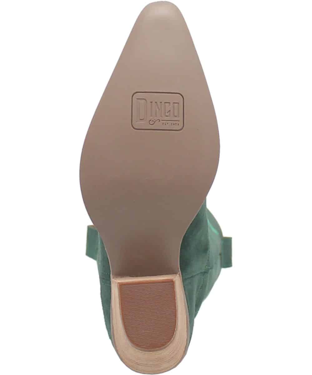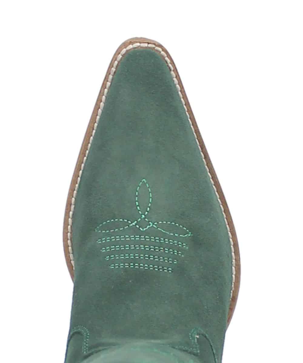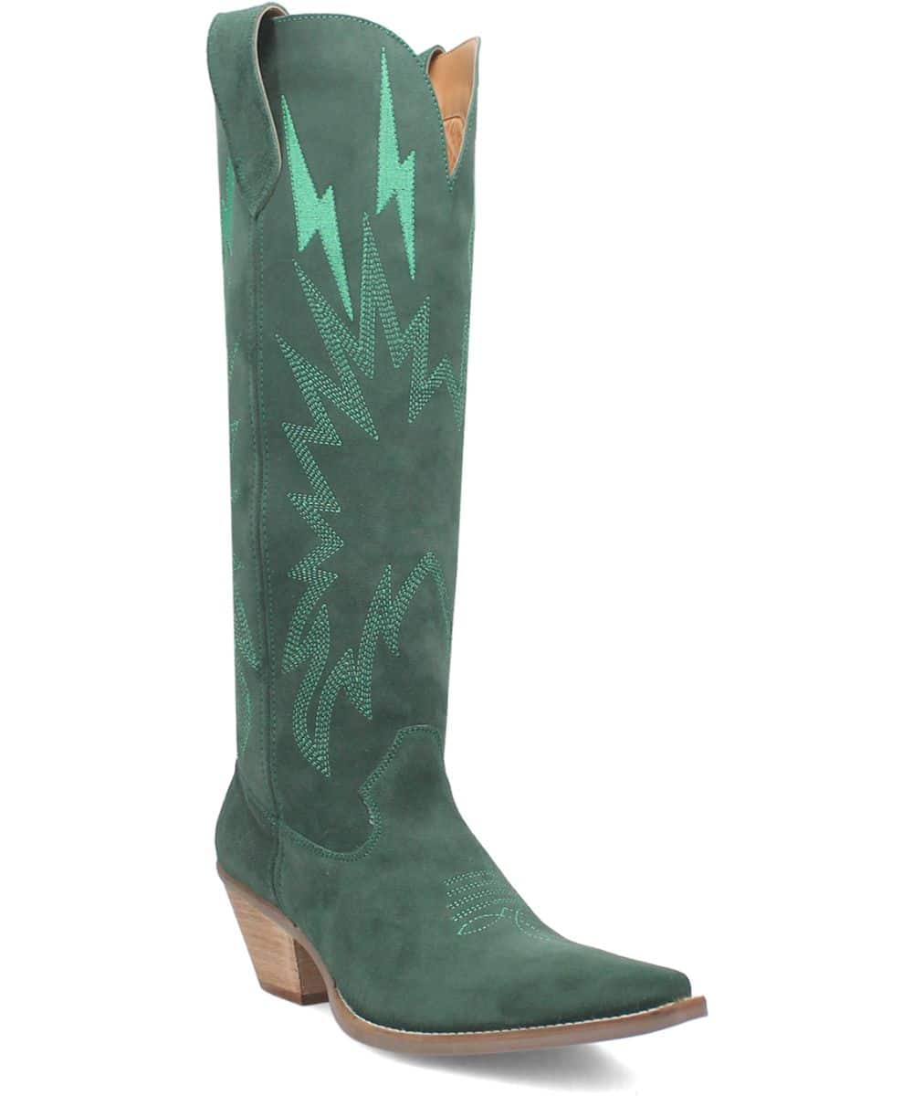 16″ Shaft; Suede Leather; Thunder Embroidery On Upper; Leather Pull Tabs For Easy On; Cushion Comfort Insole; TPR Rubber Outsole; 2 1/2″ Tall Fashion Heel; Snip Toe; Color: Green; Style #DI597-GN