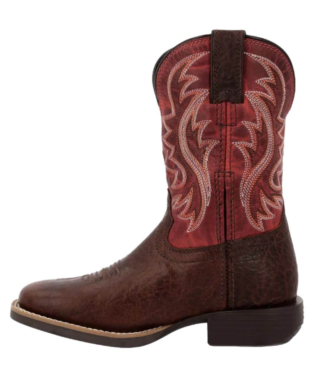 8″ Shaft; Full Grain Leather Upper; Mahogany Brown Vamp; Dynamite Red Shaft With Contrast Stitching; Leather Pull Tabs For Easy On; Durango X-Pand System For Easy On/Off; Soft Mesh Lining; Cushion Flex Insole; Double Row Sole Stitch; Fiberglass Shank; Slip Resisting Rubber Outsole; 1″ Heel; Square Toe; Color: Brown/Red; Style #DBT0251Y