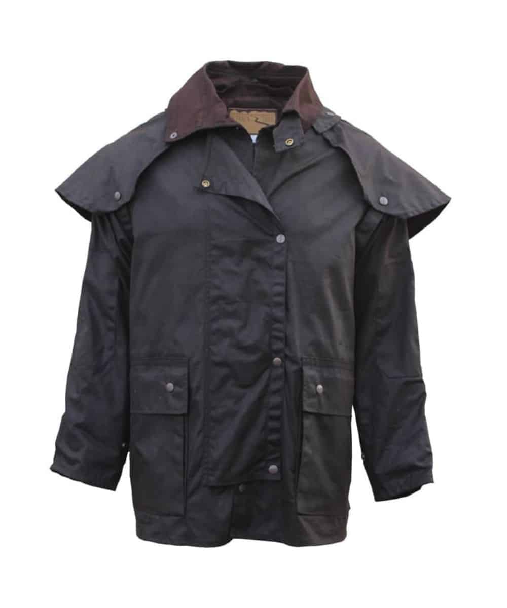 Outback Trail Short Snowy River Riding Coat; Heavyweight Waxed Cotton; Long Sleeves; Spread Collar; Snap Front Closure; Detachable Shoulder Cape With Straps; Smooth Taffeta Sleeve Lining; Storm Front Closure; Fantail Back; Adjustable Cuffs; Extra Layer Of Fabric On Sleeve Forearm For Water Protection; 2 Outside Patch Pockets With Handwarmer Pockets Underneath; Drawstring Waist For Adjustment; Cotton Lined Interior With An Inside Pocket; All Major Seams Double Stitched; Unisex Fit; Style #SSH