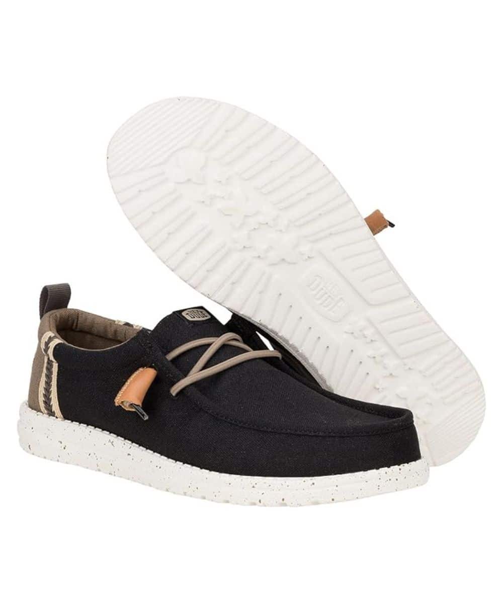 Summer Linen Black/Walnut Textile Upper; Elastic Laces With Like-Leather Tassels; Easy-On System; Heel Pull Tab; Removable Foam Insole; Contrast Heel; Lightweight Flexible Outsole; Moc Toe; Color: Black; Style #43086-02M