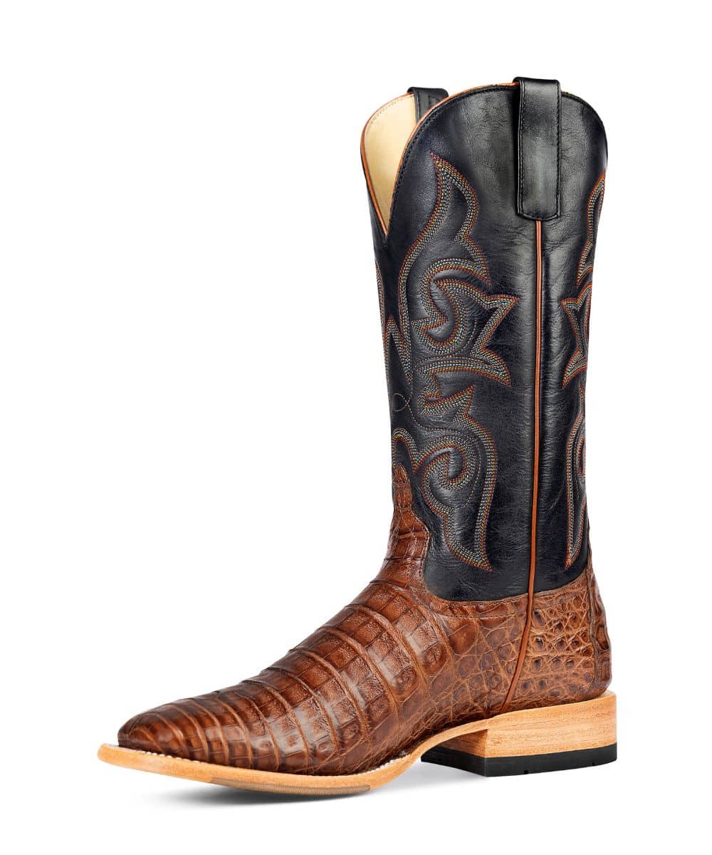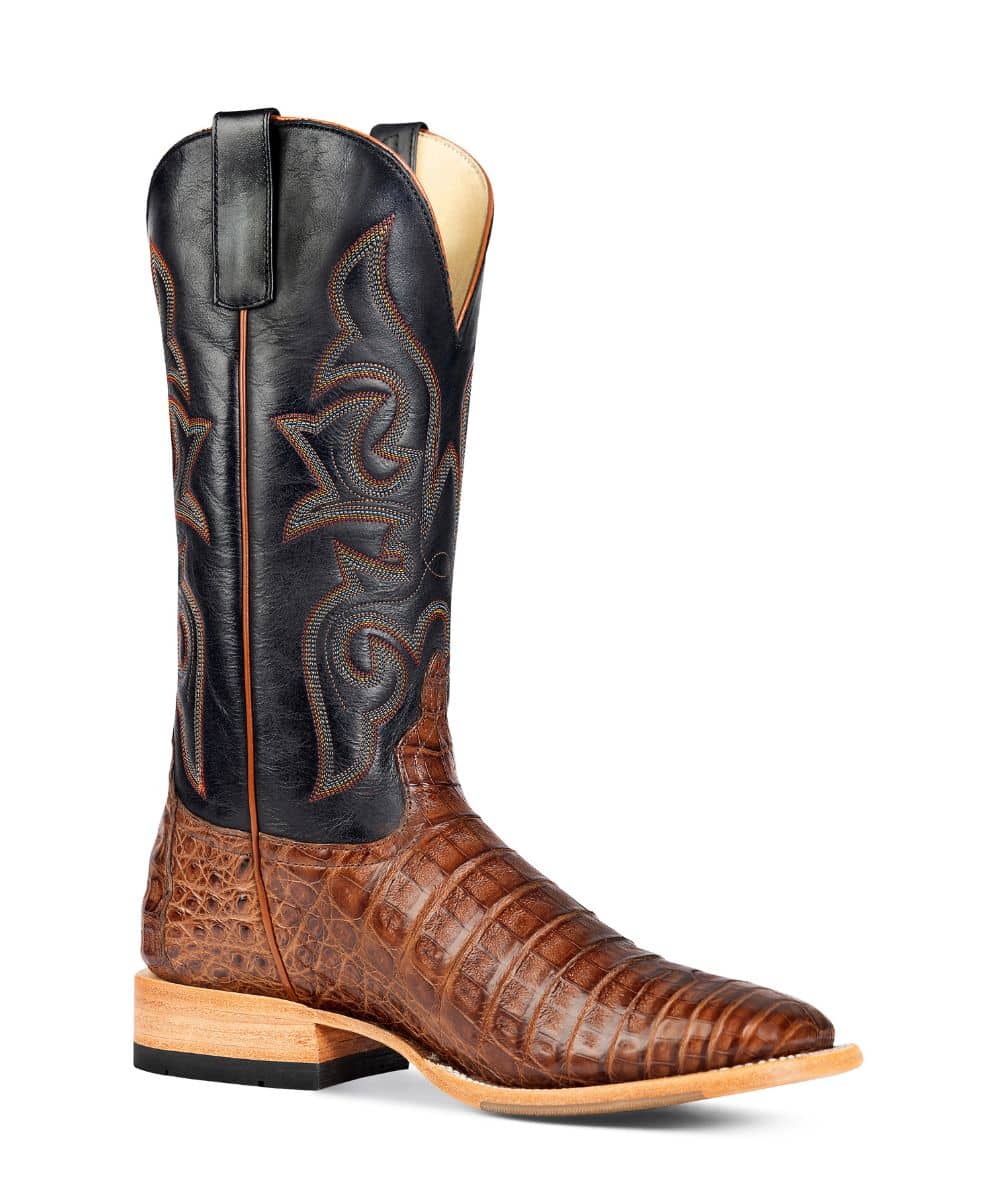Top Hand Collection; 13″ Shaft; Cigar Pull Up Caiman Leather Vamp; Black Texas Leather Shaft With Contrast Western Stitching; Cigar Piping; Leather Pull Tabs For Easy On; Cushion Insole; Tan Hybrid Outsole; Roper Leather Stacked Heel; DB Toe; Color: Brown/Black; Style #HP8082