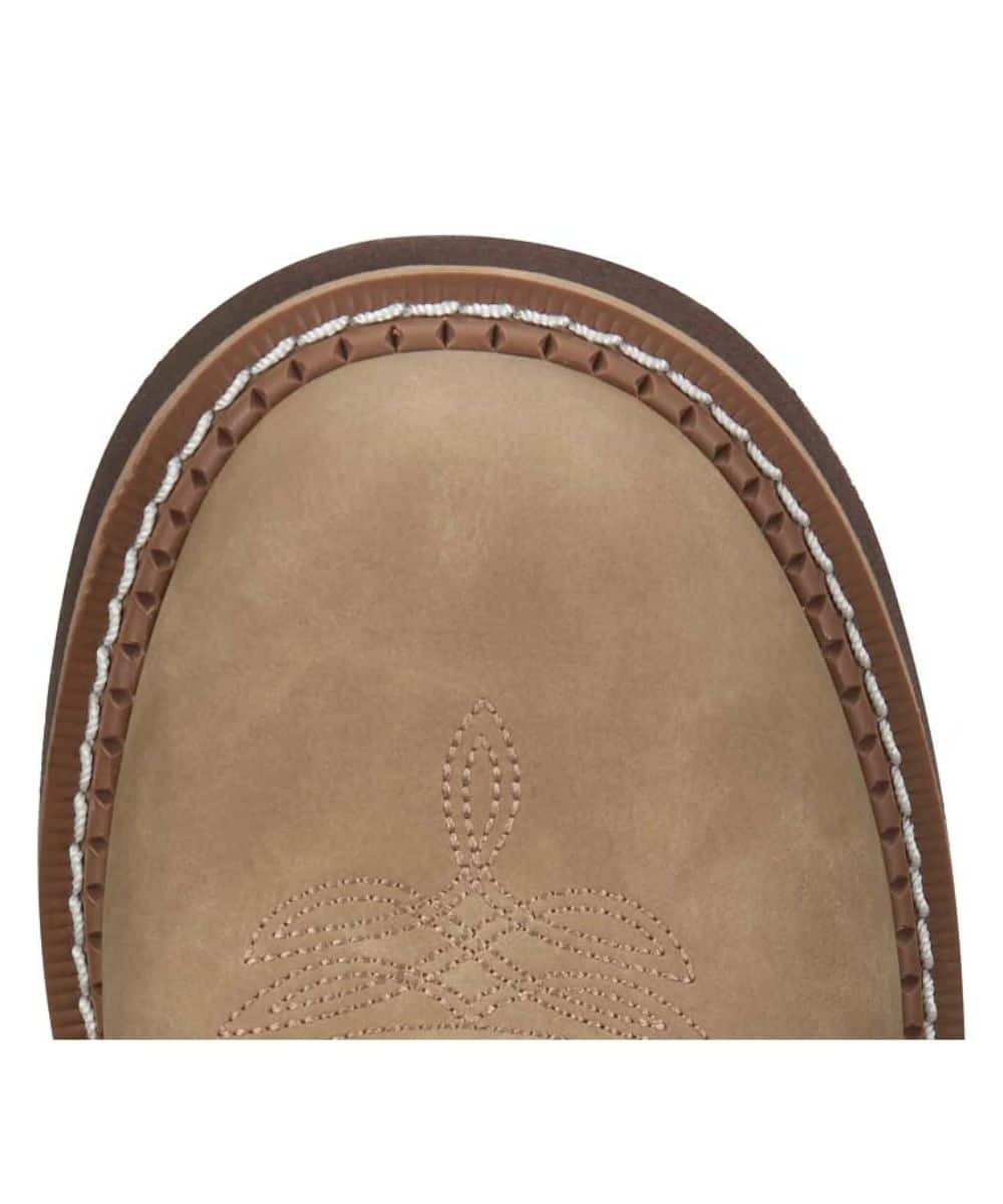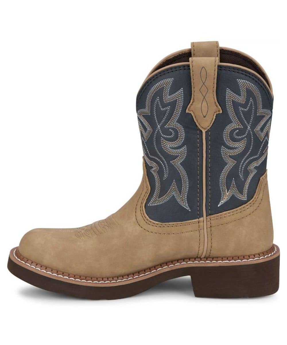 8″ Shaft; Full Grain Leather; Honey Foot; Navy Blue Upper With Western Stitching; Leather Pull Tabs For Easy On; Woven Lining; Removable Orthotic Insole; Cement Construction With Single Row Stitch; Slip Resisting Rubber Outsole; Round Toe; Color: Tan/Navy; Style #GY9550