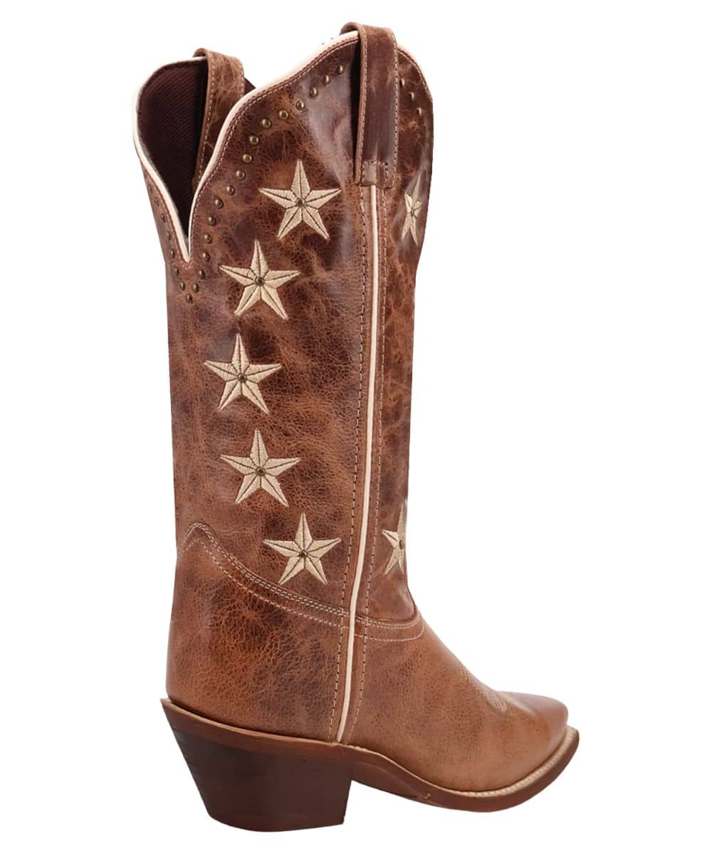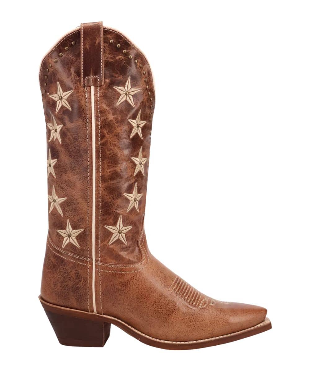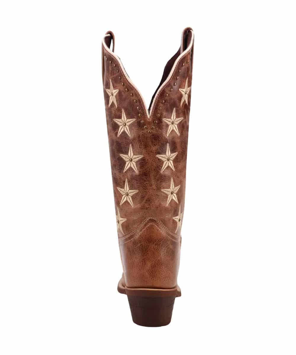 12″ Shaft; Leather Boot Accented With Star Stitching On The Shaft With Bold Embellished Studs; Leather Pull Tabs For Easy On; Textile Lining; Cushion Comfort Insole; Laredo Flex Rubber Outsole; Medium Cowboy Heel; Snip Toe; Color: Brown; Style #20014