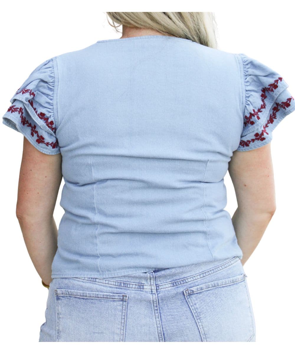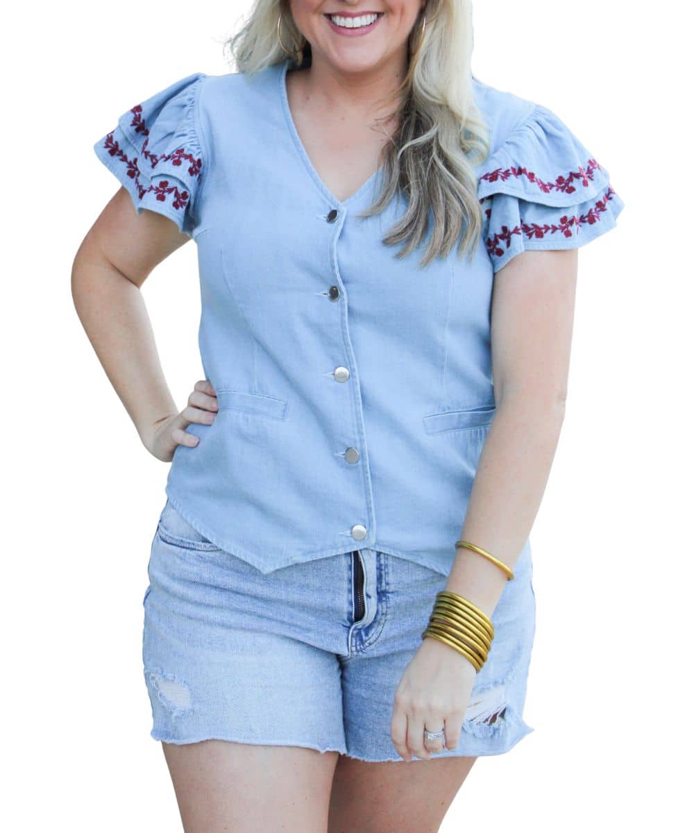 100% Cotton; Short Double Ruffle Sleeves; V-Neckline; Button Down Closure; Vest-Inspired Top With Maroon Floral Embroidery On Sleeves; Faux Hand Pockets; Light Wash Denim; Color: Blue; Style #CR1841