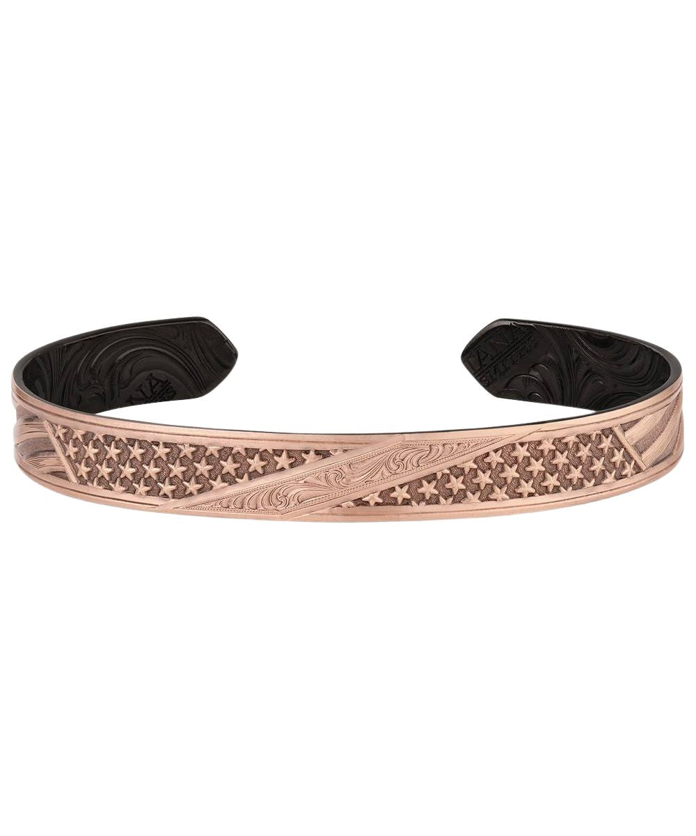 Black Nickel Over Brass Base; Adjustable Open Cuff Bracelet; Featuring The Stars And Stripes In A Copper Toned Finish; Etched And Antiqued Design; One Size Fits Most; Montana Armor To Prevent Tarnish; Made In Montana; Measures Approximately: 0.39" W x 0.61" H x 7" L; Color: Brass; Style #AMBC6414BLB