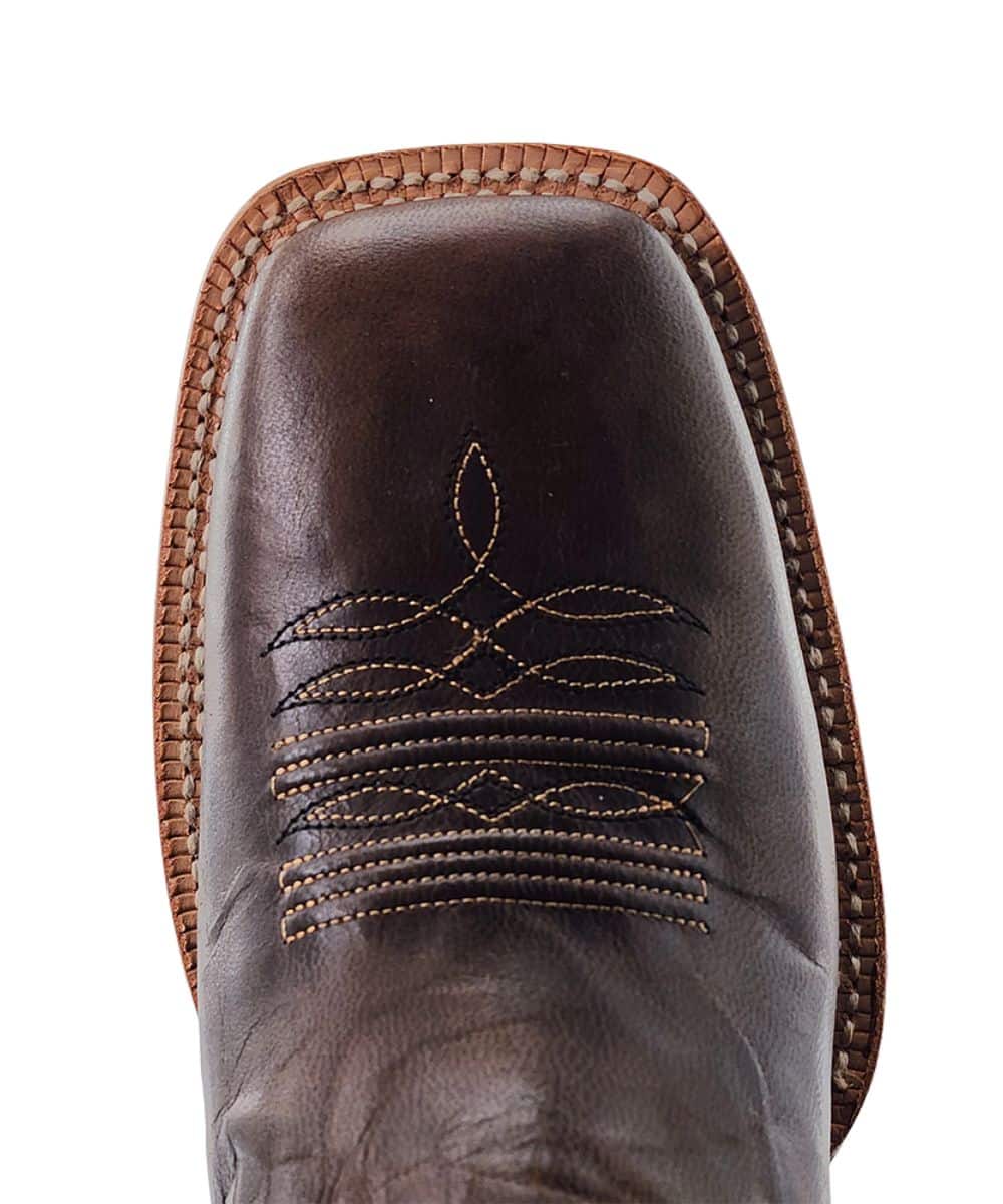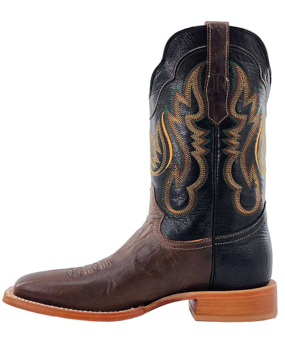 11″ Shaft; Toscama Miel Soto Cowhide Leather Vamp; Black Sinatra Goat Leather Upper With 10 Row Stitch Pattern; Leather Pull Tabs For Easy On; Leather Wrapped Memory Foam Insole; Solid Steel Shank; Leather Outsole; Walking Heel; Wide Square Toe; Color: Brown/Black; Style #RW8003-2