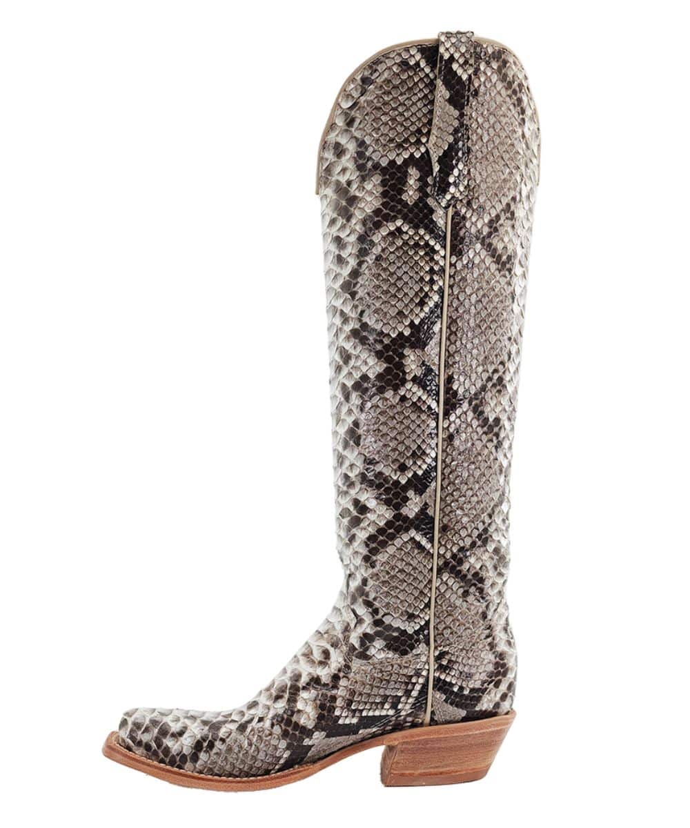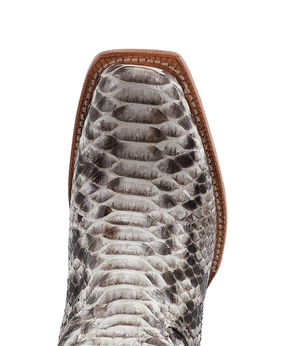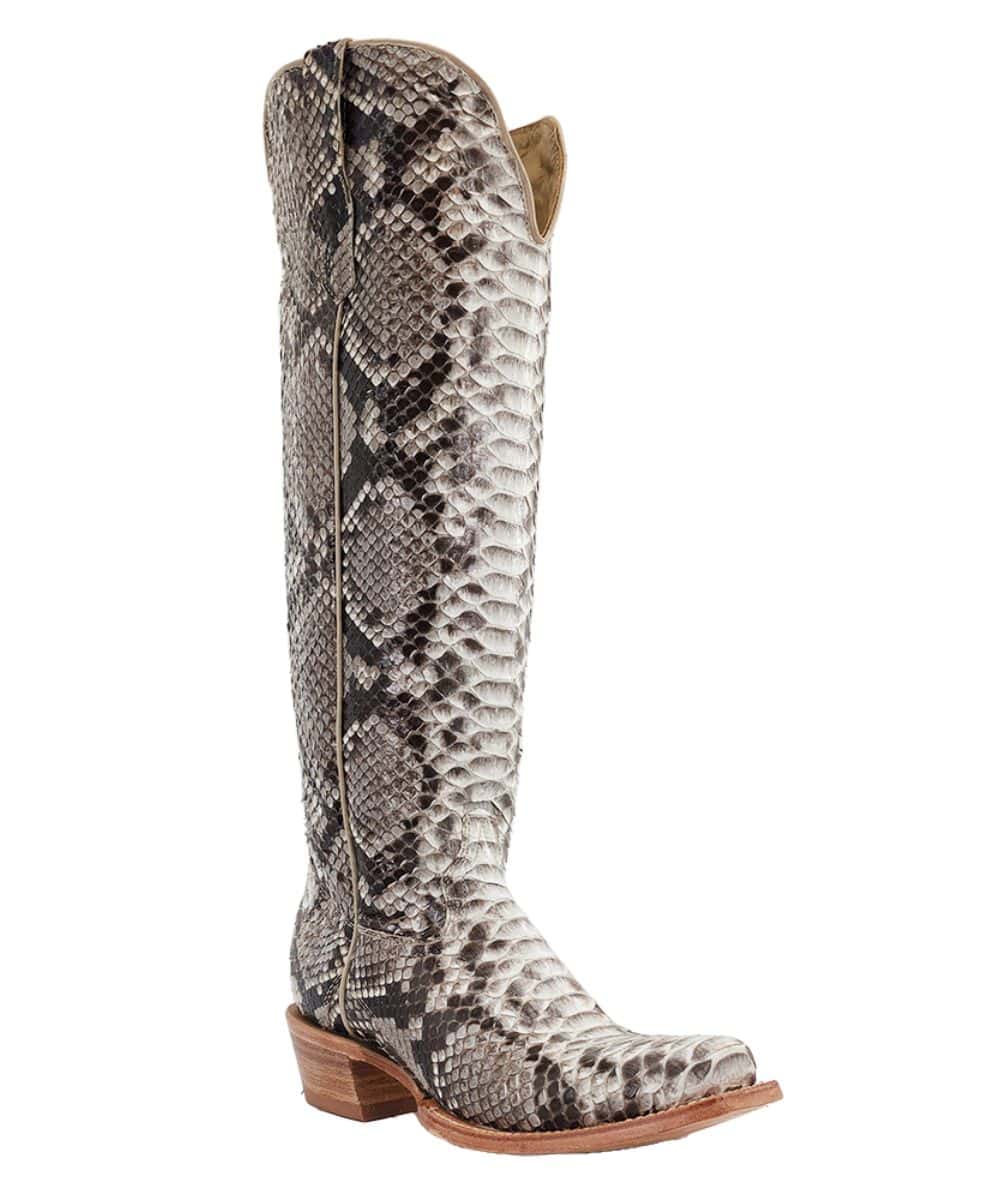 17″ Boot; Full Python Vamp And Upper; Python Leather Pull Tabs For Easy On; R. Watson Comfort System; All Leather Stacked Cowboy Heel; Solid Steel Shank; 10 Iron Outsole; Cutter Toe; Color: Black And White; Style #RWL7210-1