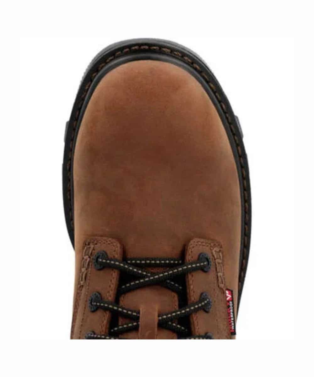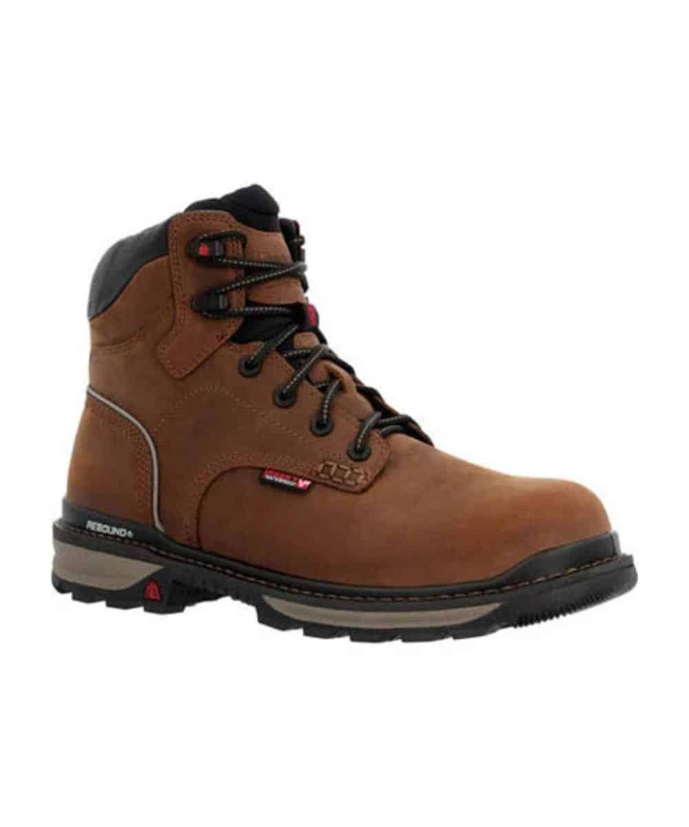 6″ Shaft; Waterproof Full Grain Leather; Lace-Up Entry; Energy Bed LX Footbed With Memory Foam; Rocky Rebound Comfort Technology For Energy Return; Fiberglass Shank; Light And Flexible Cement Construction With Direct Attached PU Midsole And Secondary EVA Midsole; Flexible Direct Attached PU Midsole; Oil And Slip Resisting Rubber Outsole; Round Composite Toe; ASTM F2413 Protective Toe Classification; ASTM F2413 Electrical Hazard Standard; Rocky Vapor Pass Waterproof; Color: Dark Brown/Crazy Horse; Style #RKK0388