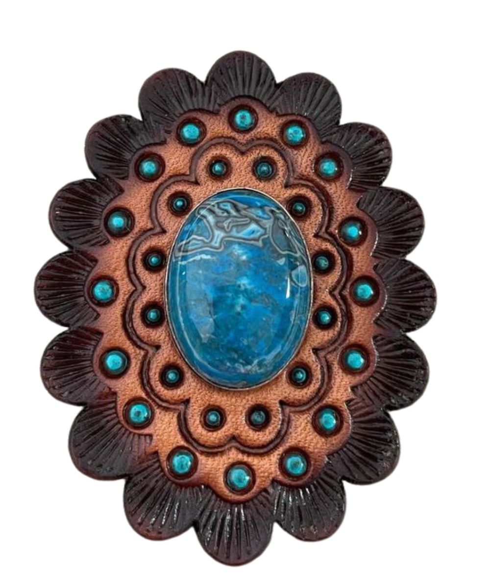 Leather; Oval Shaped; Scalloped Dark Edges; Tooled Design; Hand Painted Turquoise Dots; Blue Cabochon Stone In Center; Chicago Screws Included; Measures Approximately: 2.75″L x 2″W; Style #WRSR104BL