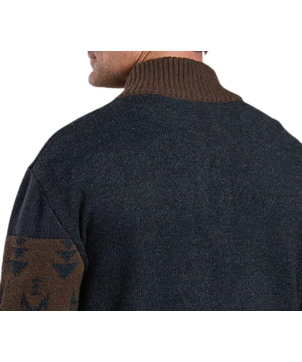 60% Cotton/30% Nylon/10% Wool; Long Sleeves; Mock Collar; 1/4 Zip Closure; Heathered Brown Yarn Aztec Pattern Woven Into The Front And Sleeves; Self Knitted Collar, Cuffs, And Waistband; Color: Grey; Style #11-014-0120-6182