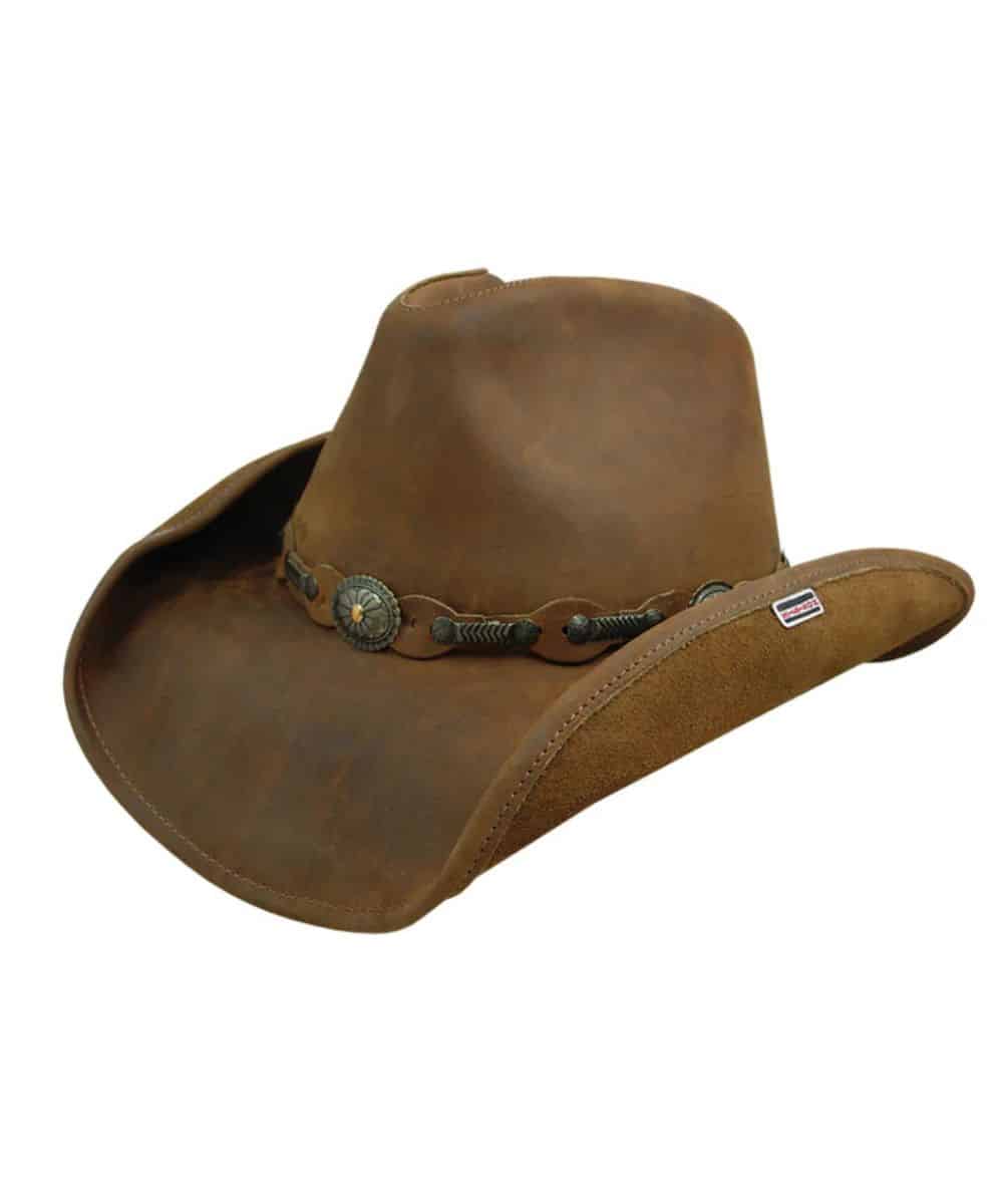 Genuine Distressed Leather; 3 1/2″ Shapeable Brim; Pinched Front Crown; Leather Hat Band With Concho Accents; Style #TRROXB-8434