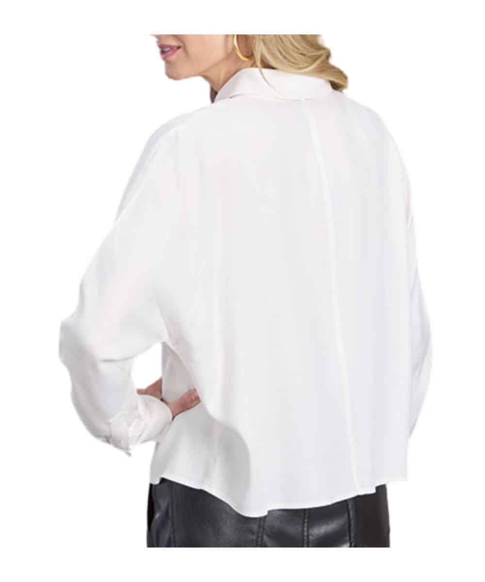 100% Rayon; Long Dolman/Raglan Sleeves; Loose Spread Collar; Button Front Closure Under Hidden Front Placket; Single Point Left Chest Patch Pocket; Deep Cuffs With Single Button Closure; Full Seam Down Center Back; Color: White; Style #11-050-0592-1054