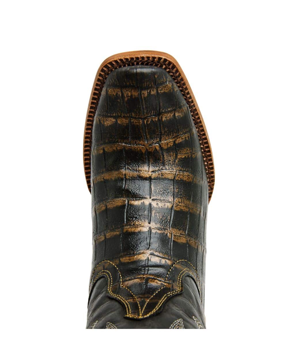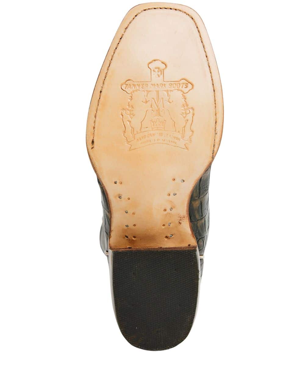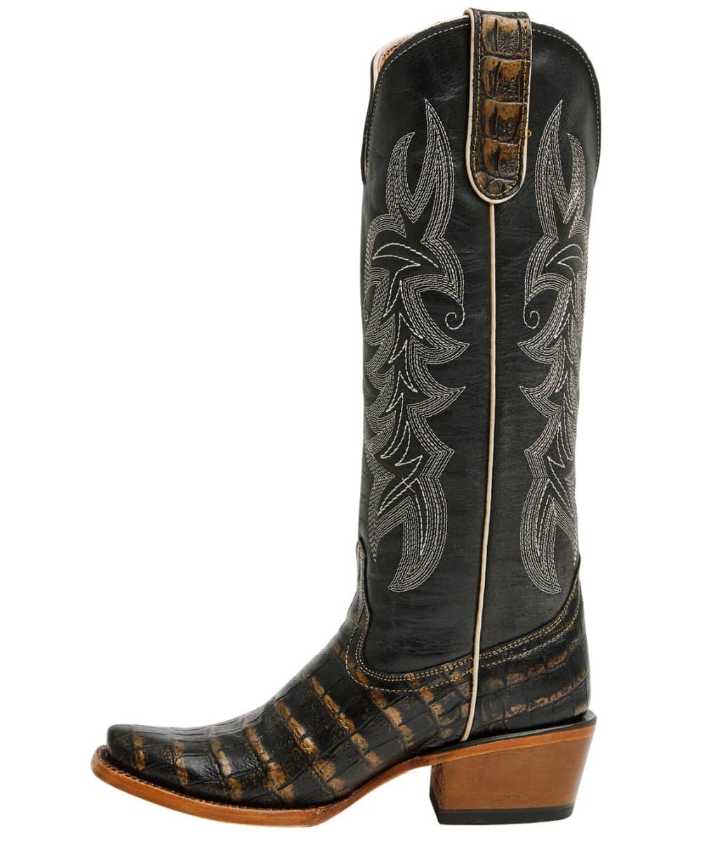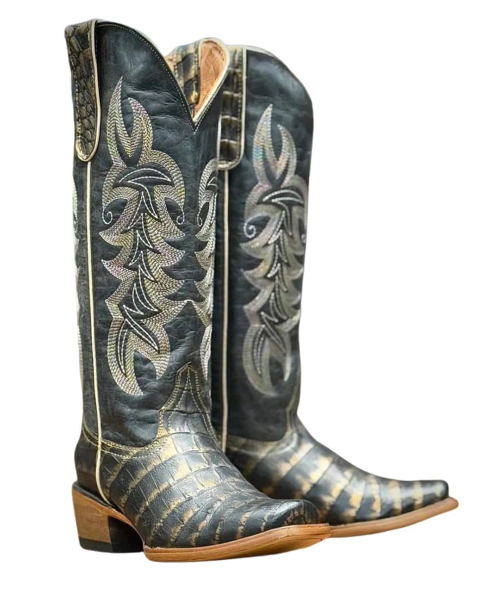 14″ Shaft; Vintage Black And Gold Imitation Caiman Belly Print Vamp; Vintage Navy Shaft With Contrast Stitching; Leather Pull Tabs For Easy On; Cushion Comfort Insole; Single Stitched Welt; Leather Outsole With Natural Finish And Rubber Heel Cap; Western Heel; 989 Blunt Toe; Color: Black/Navy; Style #TML205417