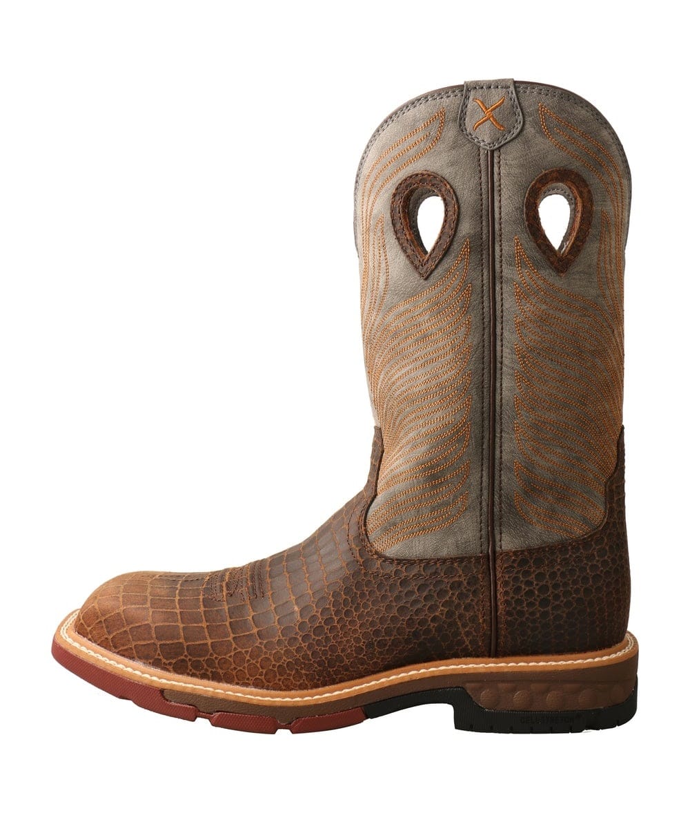 12″ Shaft; Full Grain Leather; Leather TWX Shaft With Taped interior Seams; Leather TWX Material Utilizes 80% Recycled Leather That Would Otherwise End Up In Landfills; Air Mesh Lining; Reinforced Pull Holes; Molded Footbed; Compression Molded EVA Midsole Integrated With Molasses Which Reduces The Amount Of EVA Used; CellStretch Technology Utilizes Cells In The Forefoot And Heel To Provide Cushioning And Comfort; Double Stitched Storm Welt; Nylon Glass Fiber Shank; Nano Composite Safety Toe; Wide Square Toe; 1.5″ Block Heel; Electrical Hazard Rated And Oil And Slip Resistant Molded Rubber Outsole; Nano Composite Safety Toe Meets ASTM F2413-18 M/I/C And EH Standards; Color; Brown Foot/Gray Upper With Orange Accent Stitching; Style #MXBN005