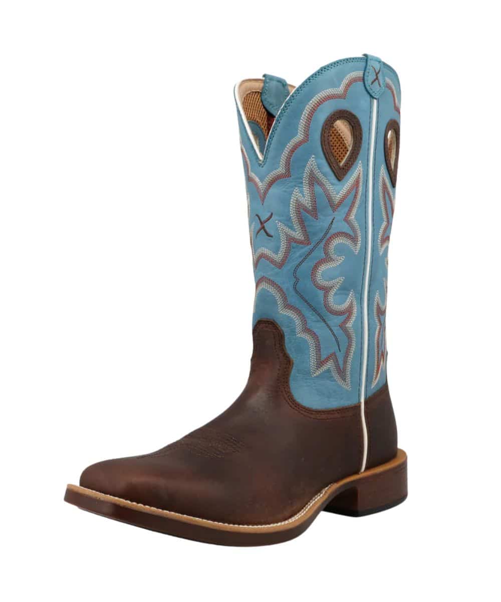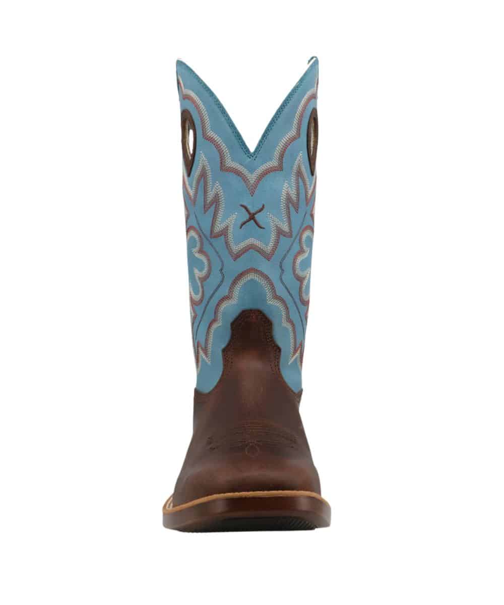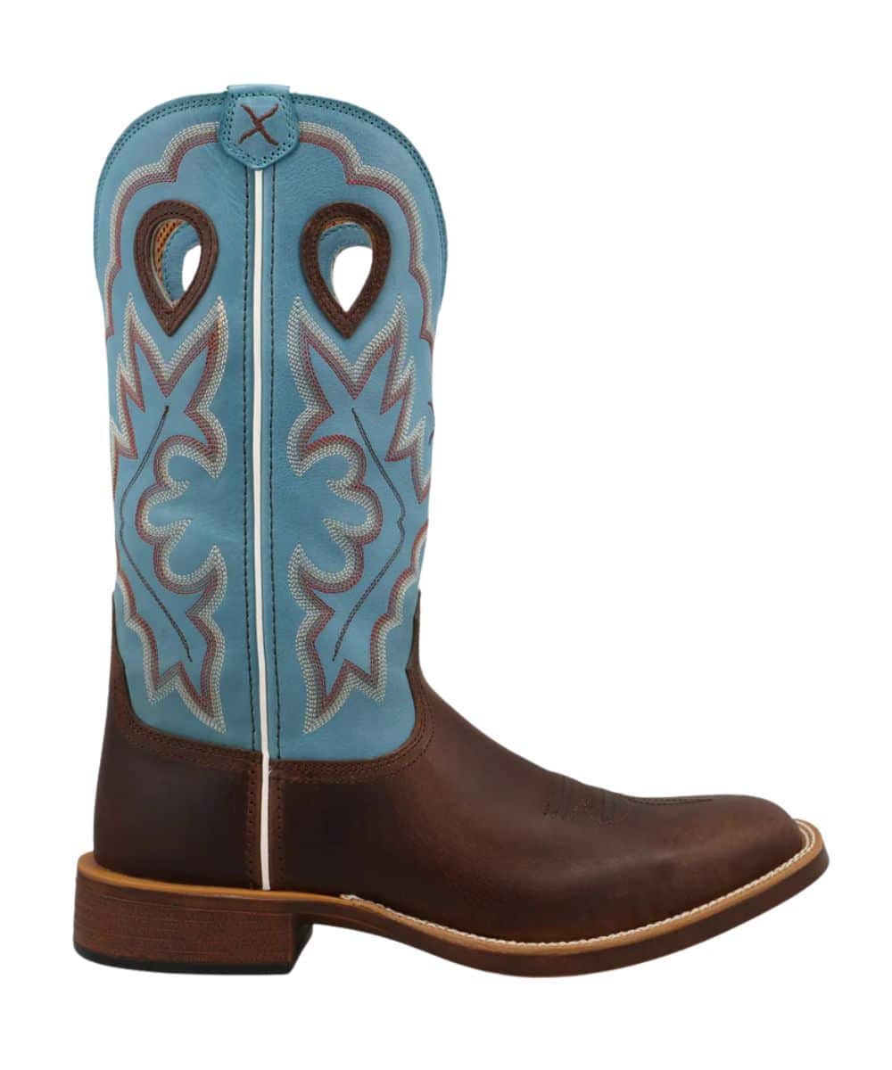 13″ Shaft; Dark Brown Leather Vamp; Lagoon Blue Leather Shaft With Contrast Stitching; White Piping; Reinforced Pull Holes For Easy On; Air Mesh Lining With Taped Interior Seams; Blend85 Footbed Made With 85% Recycled Foam; EcoTWEED Lining Made From Recycled Plastic Bottles; Double-Stitched Welt; Composite Shank; Slip Resistant PU Outsole; 1.25″ Western/Block Heel; Integrated Spur Shelf; ASTM F3445-24 SR; WS/Wide Square Toe; Color: Brown/Blue; Style #MTH0031