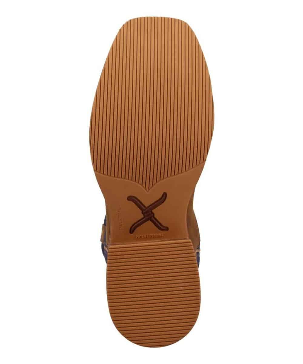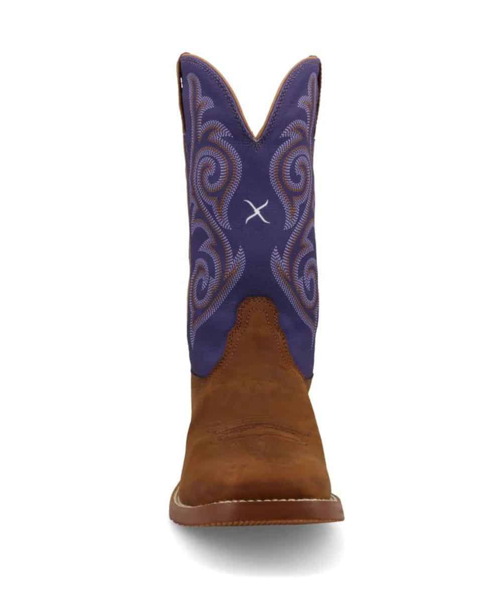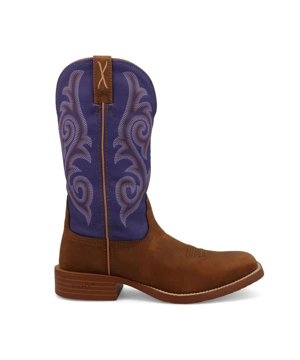 11″ Shaft; Brown Leather Vamp; Purple Fabric Shaft; Leather Pull Tabs For Easy On; Air Mesh Lining With Taped Interior Seams; Blend85 Footbed With EcoTWEED Lining; CellStretch Comfort Technology; Double-Stitched Welt And Nylon/Glass Fiber Shank; Rubber Leather-Look Outsole; 1.25″ Walking Heel; Integrated Spur Shelf; WS Toe; Color: Distressed Saddle/Iris; Style #WXTR009