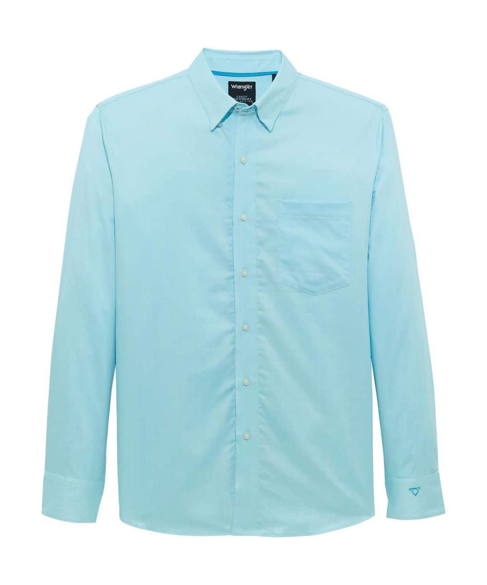 100% Cotton; Classic Fit; Long Sleeves; Hidden Button Down Collar; Button Down Placket And Cuffs; Single Open Chest Pocket; Straight Back Yoke; Mitered Cuffs With Cody Johnson’s Signature Logo Embroidery; Solid Print; Color: Aqua; Style #112365523