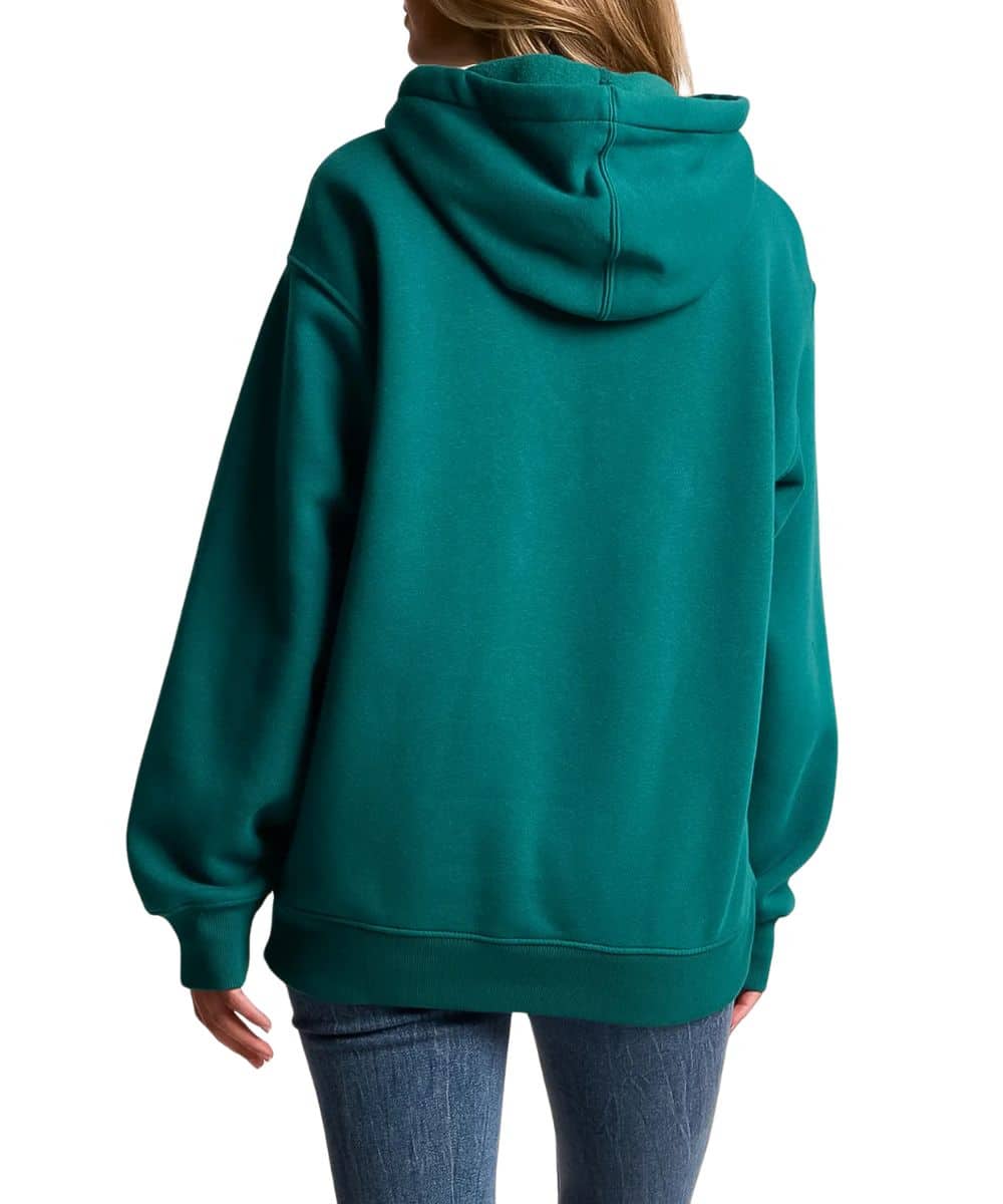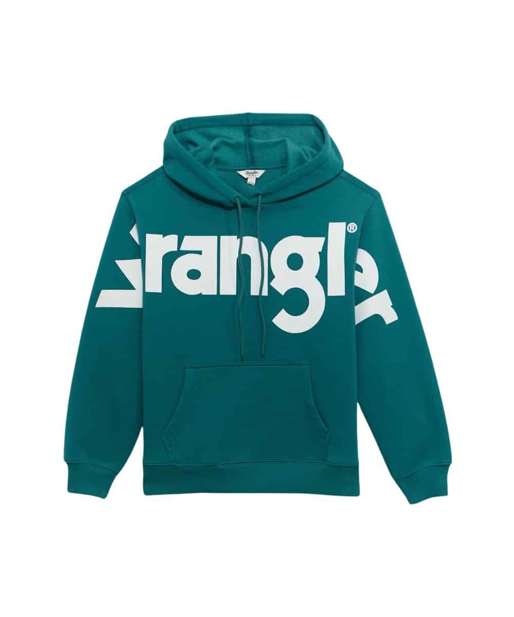 70% Cotton/30% Polyester; Regular Fit; Long Sleeves; Hooded Collar With Drawstring; Dropped Shoulders; Bold White Wrangler Logo Screen Printed Across Chest And Sleeves; Kangaroo Pocket; Ribbed Cuffs And Hem; Color: Teal; Style #112374829
